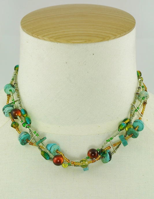 New Zealand Made Turquoise & Glass Multi Strand Necklace With Magnetic Clasp