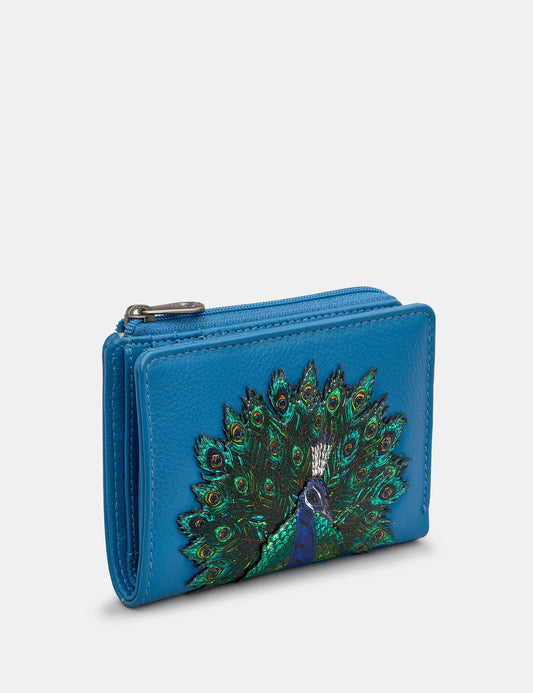Yoshi Peacock Plume Appliqued Leather Petrol Blue Flap Over Zip Around Wallet - Y1261 PCK 48