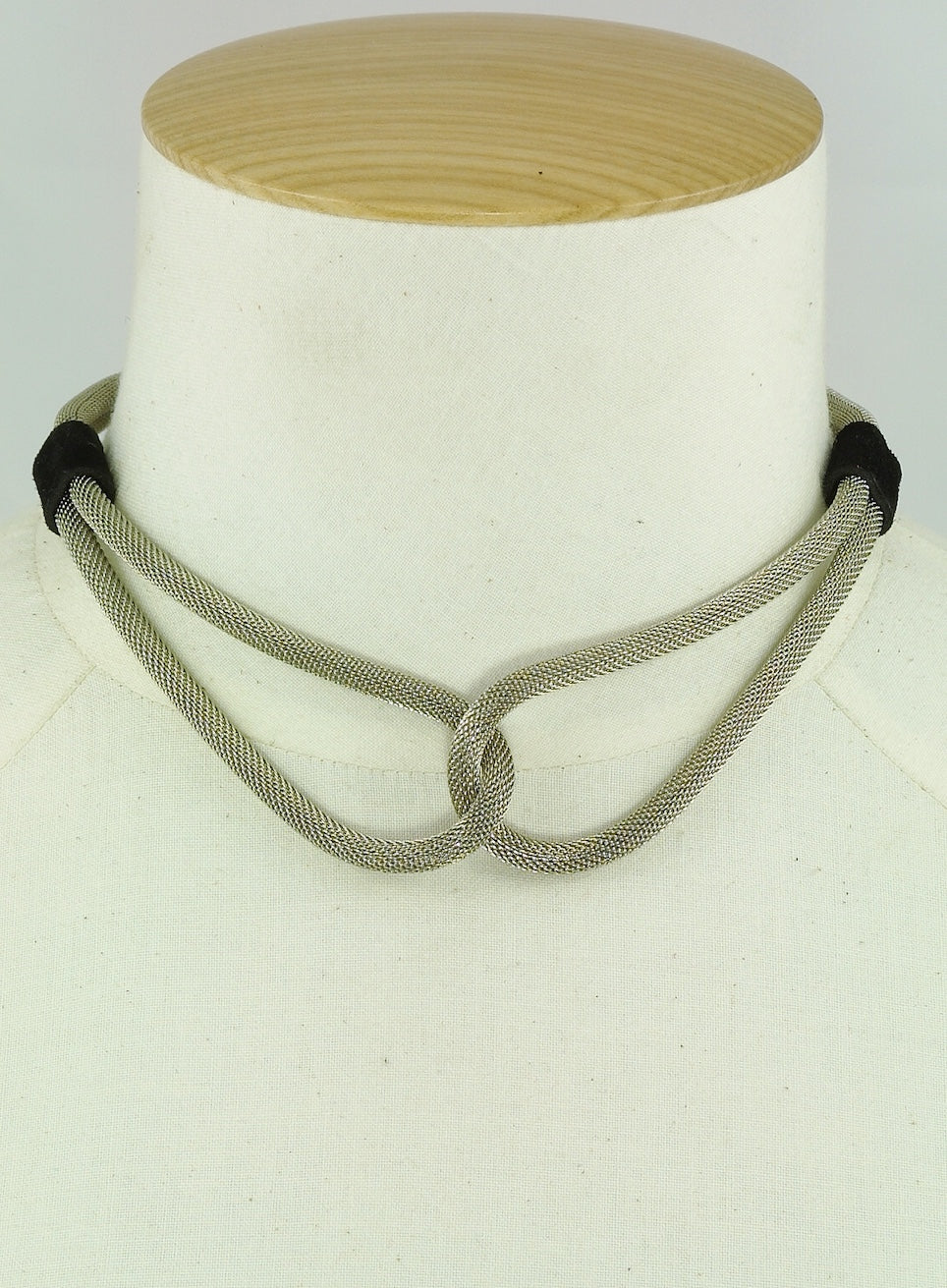 Alessandra Calvani is an Italian architect and jewellery designer. This modern necklace features black suede and metal with a simple magnetic clasp.