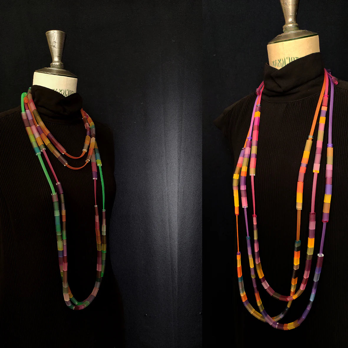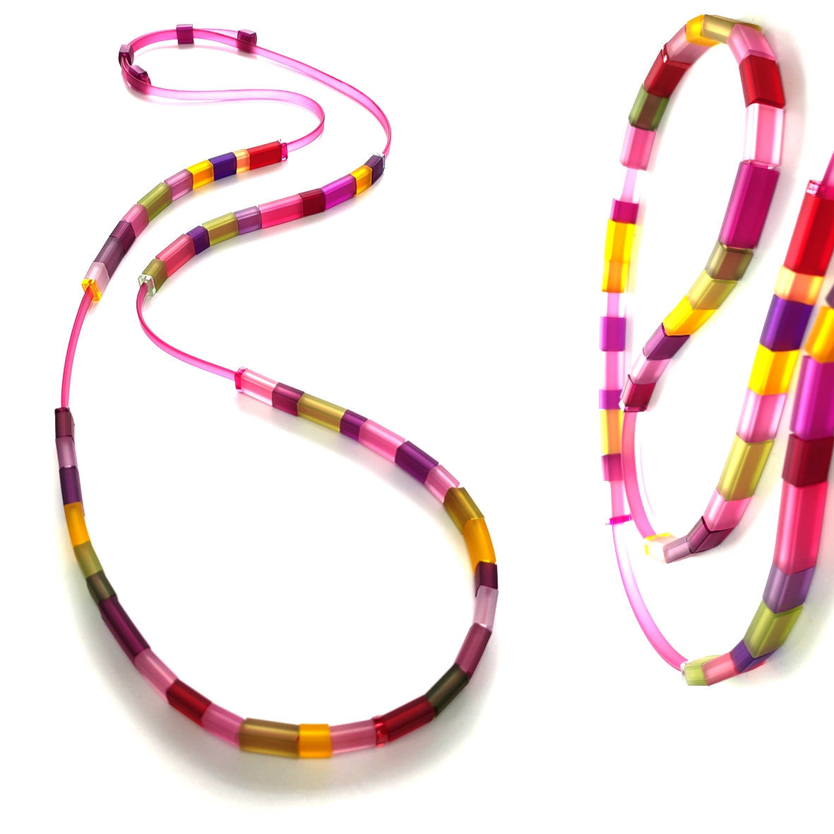 Mozaik is a soft and versatile adjustable multi-coloured long rubber necklace.