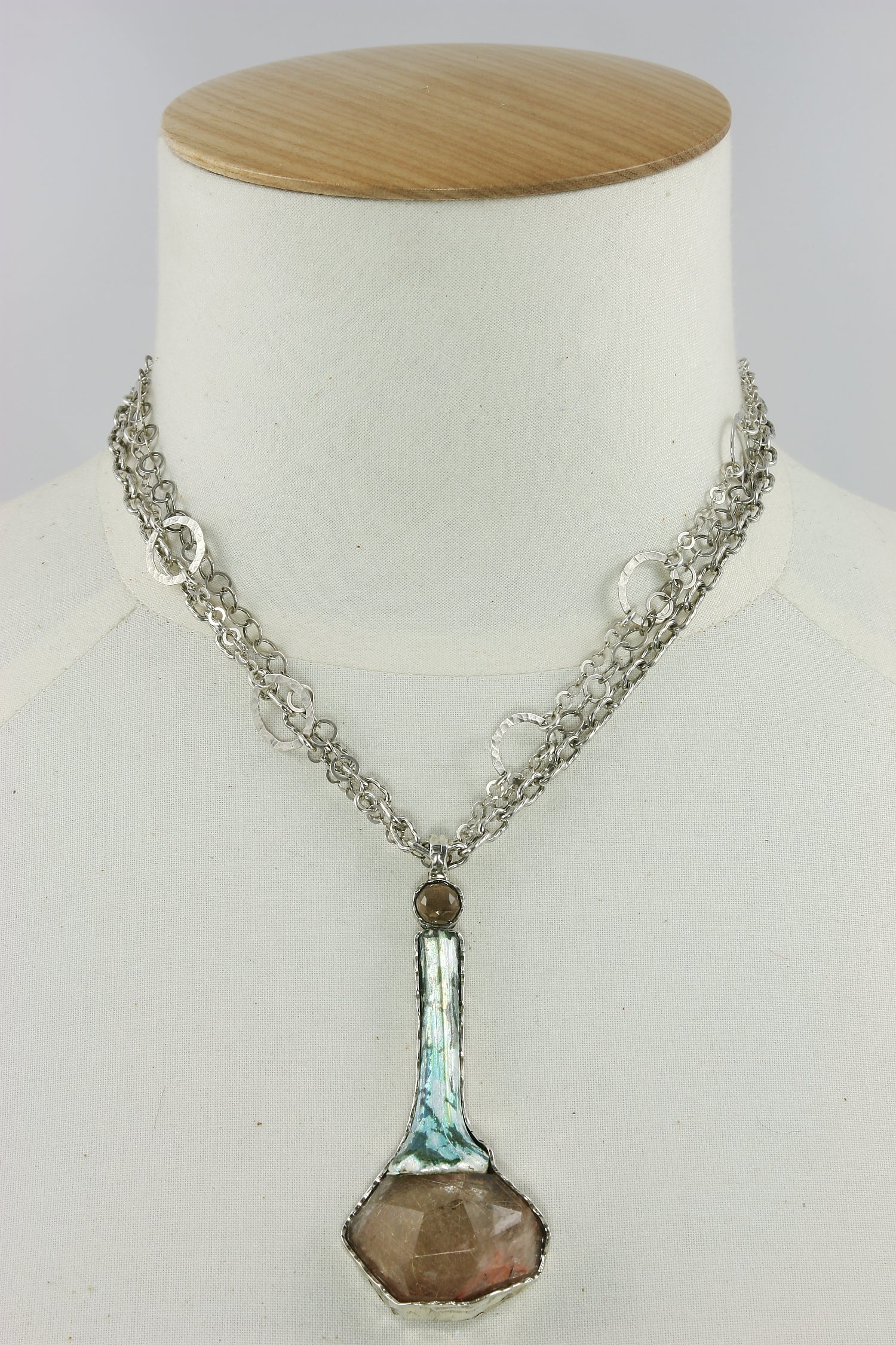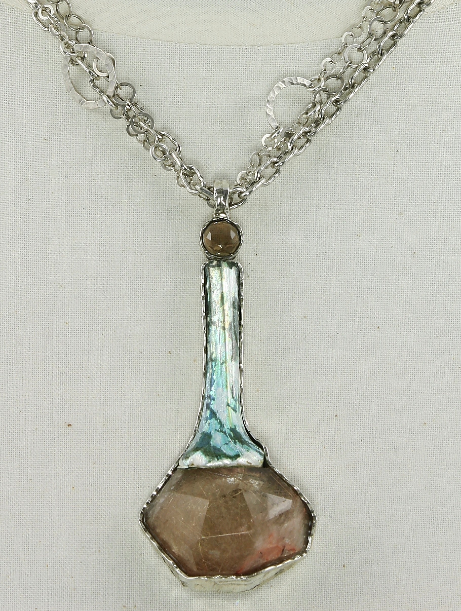 This stunning designer necklace features a piece of ancient history dating from Roman Times. The glass pendant that drops from the bottom contains a beautiful piece of Ancient Roman glass. This glass has lain buried for thousands of years before being discovered and the colours are dazzling. In these pieces, the pendant is fashioned to fit the glass rather than cutting the glass to a particular shape, and as a result, each piece is a true one of a kind.