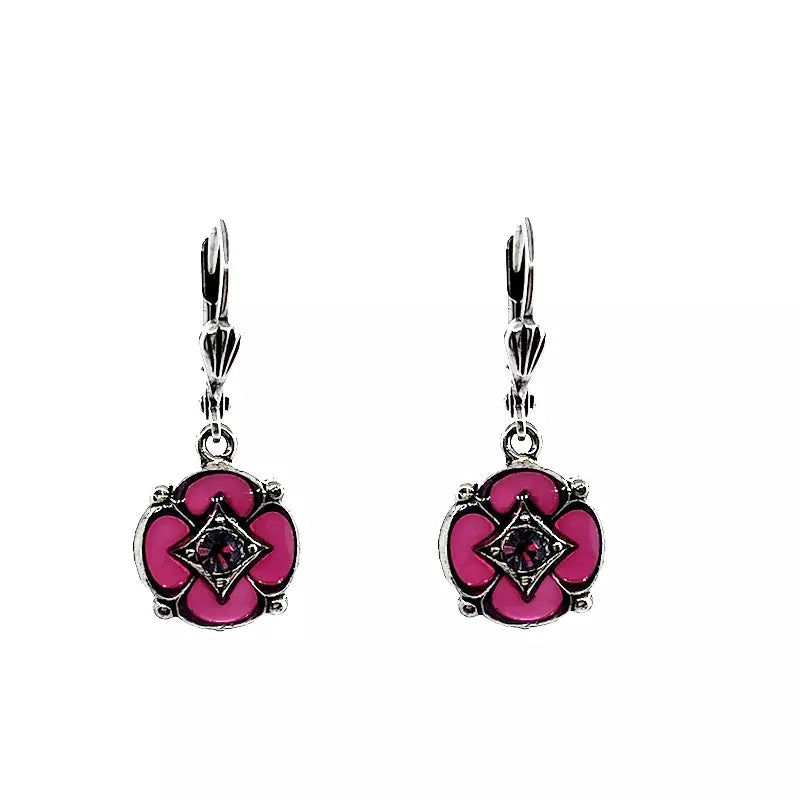 These timeless earrings in silver-plated brass and genuine Swarovski Crystal are handcrafted from original stampings and molds from 1880-1920. The stained glass effect lets the light pass through creating a stunning effect. This jewelry is handcrafted in France at the AU BOUT DES REVES workshop.