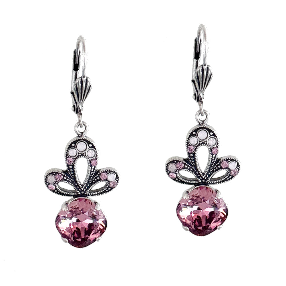 These timeless earrings in silver-plated brass and genuine Swarovski Crystal are handcrafted from original stampings and molds from 1880-1920. The stained glass effect lets the light pass through creating a stunning effect. This jewelry is handcrafted in France at the AU BOUT DES REVES workshop.
