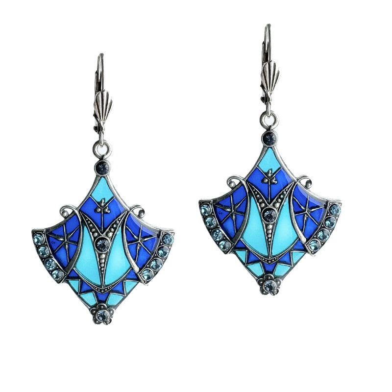 These timeless earrings in silver-plated brass and genuine Swarovski Crystal are handcrafted from original stampings and molds from 1880-1920. The stained glass effect lets the light pass through creating a stunning effect. This jewelry is handcrafted in France at the AU BOUT DES REVES workshop.