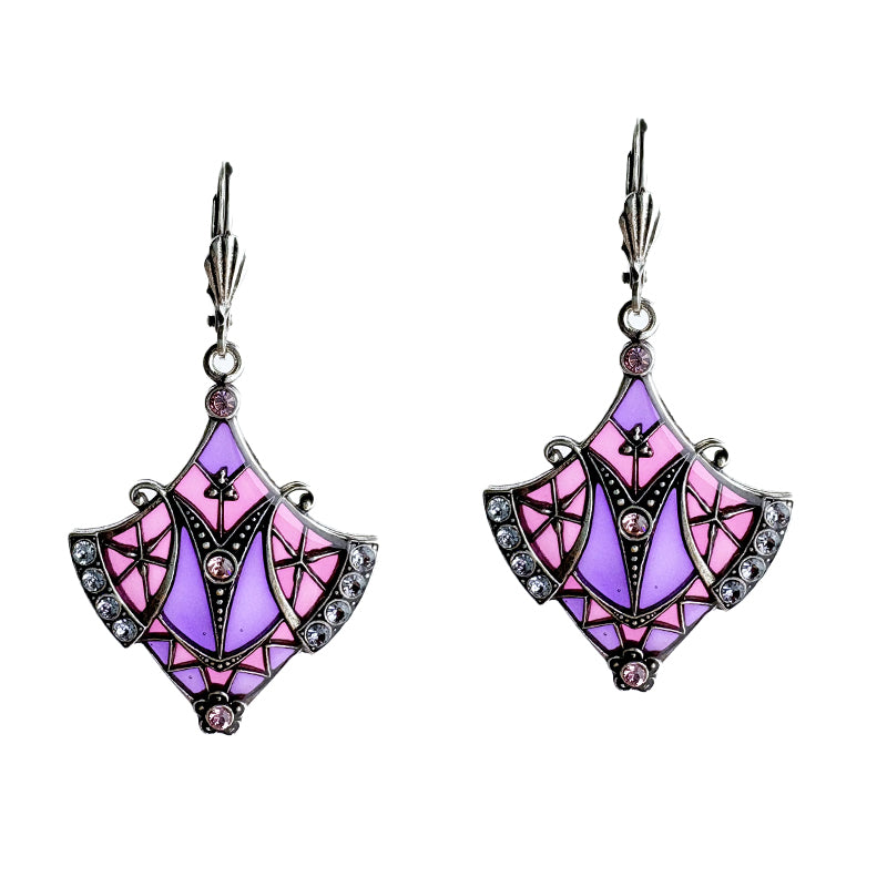 These timeless earrings in silver-plated brass and genuine Swarovski Crystal are handcrafted from original stampings and molds from 1880-1920. The stained glass effect lets the light pass through creating a stunning effect. This jewelry is handcrafted in France at the AU BOUT DES REVES workshop.