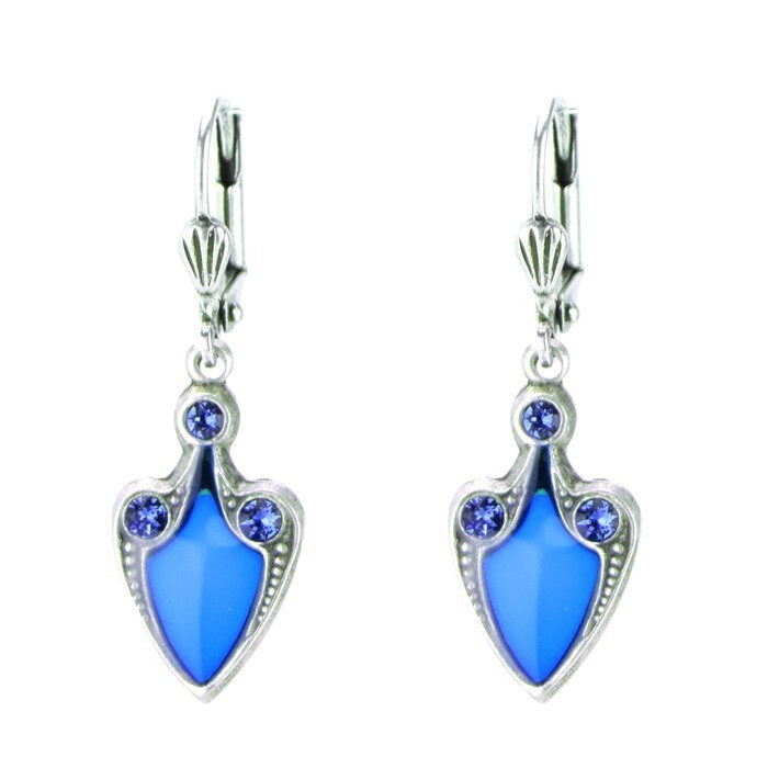 These timeless earrings in silver-plated brass and genuine Swarovski Crystal are handcrafted from original stampings and molds from 1880-1920. The stained glass effect lets the light pass through creating a stunning effect. This jewelry is handcrafted in France at the AU BOUT DES REVES workshop.