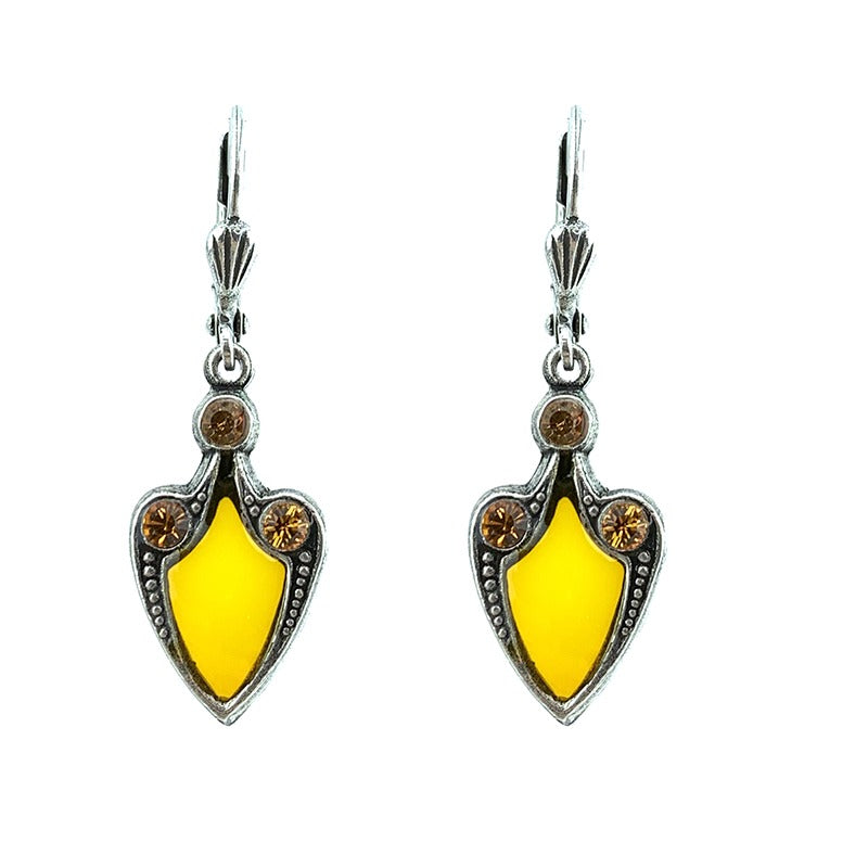 These timeless earrings in silver-plated brass and genuine Swarovski Crystal are handcrafted from original stampings and molds from 1880-1920. The stained glass effect lets the light pass through creating a stunning effect. This jewelry is handcrafted in France at the AU BOUT DES REVES workshop.