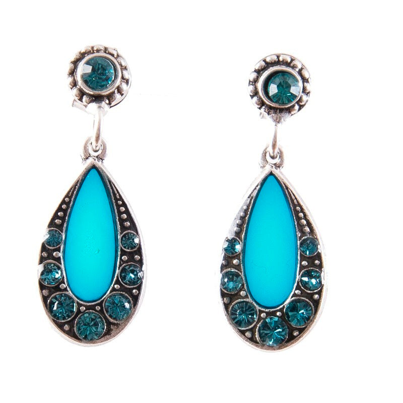 These timeless earrings in silver-plated brass and genuine Swarovski Crystal are handcrafted from original stampings and molds from 1880-1920. The stained glass effect lets the light pass through creating a stunning effect. This jewelry is handcrafted in France at the AU BOUT DES REVES workshop.