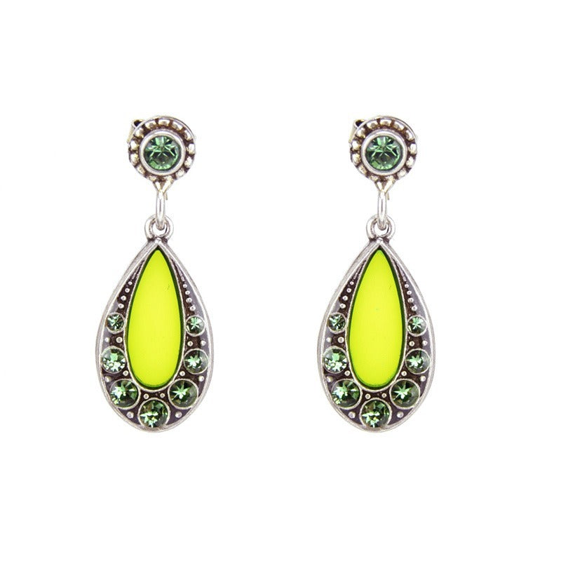 These timeless earrings in silver-plated brass and genuine Swarovski Crystal are handcrafted from original stampings and molds from 1880-1920. The stained glass effect lets the light pass through creating a stunning effect. This jewelry is handcrafted in France at the AU BOUT DES REVES workshop.