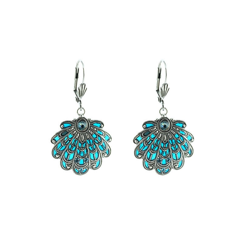 These timeless earrings in silver-plated brass and genuine Swarovski Crystal are handcrafted from original stampings and molds from 1880-1920. The stained glass effect lets the light pass through creating a stunning effect. This jewelry is handcrafted in France at the AU BOUT DES REVES workshop.