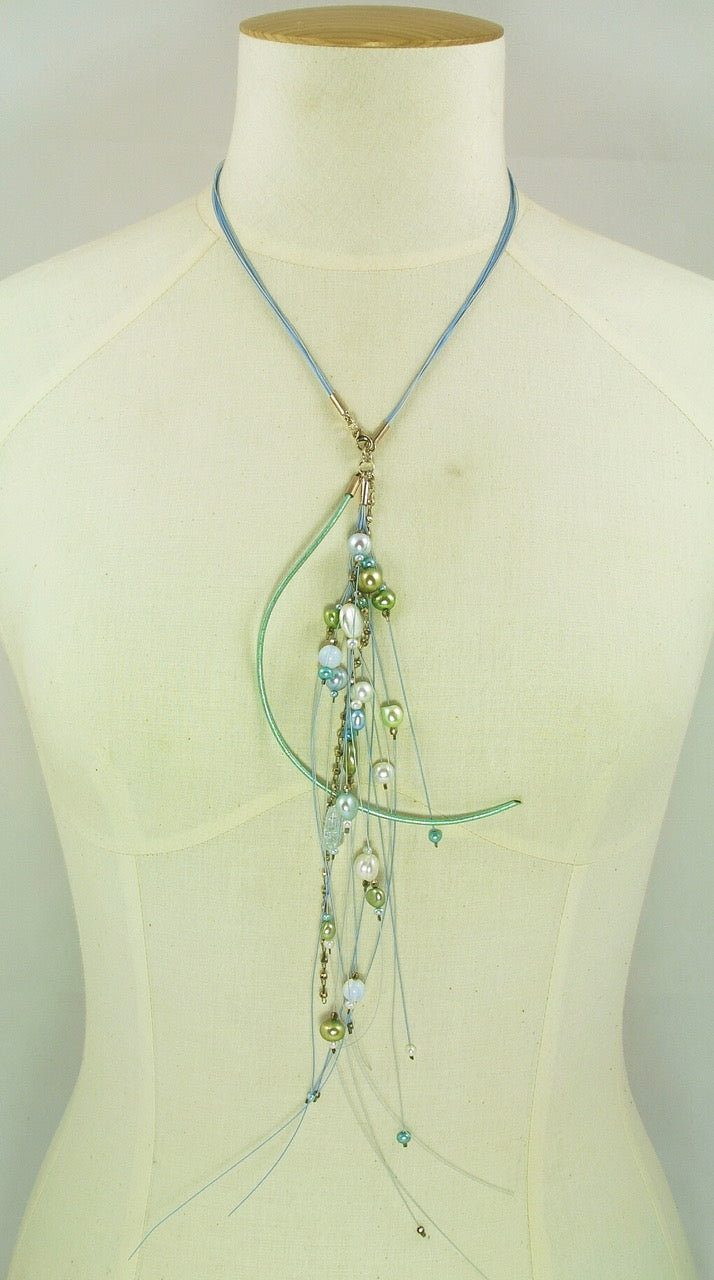 This contemporary necklace features fresh water pearls threaded on multi dangling strands as well as sterling chain and turquoise leather. Lots of gorgeous blue and green tones in this necklace and its perfect for a beach holiday and over your favourite linen tops. It's a very flattering choice creating the illusion of length and height.