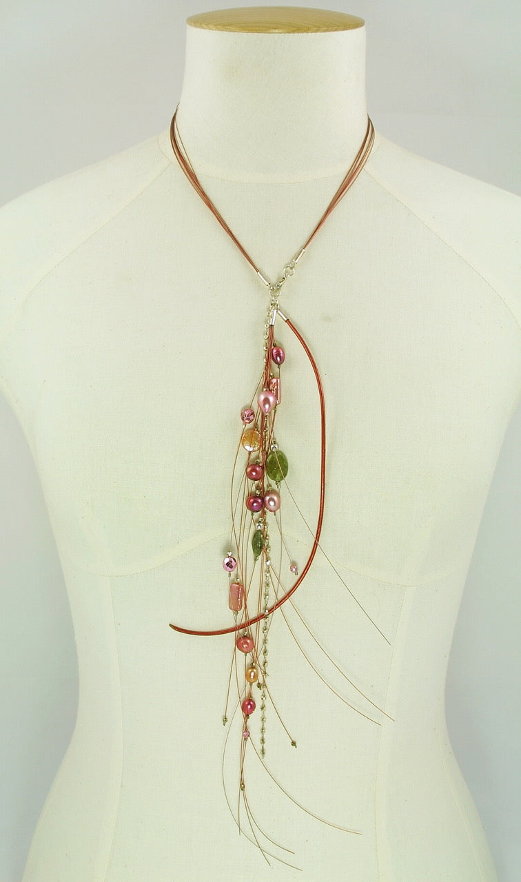 This contemporary necklace features fresh water pearls threaded on multi dangling strands as well as sterling chain and turquoise leather. Lots of gorgeous pink and orange tones in this necklace and its perfect for a beach holiday and over your favourite linen tops. It's a very flattering choice creating the illusion of length and height.