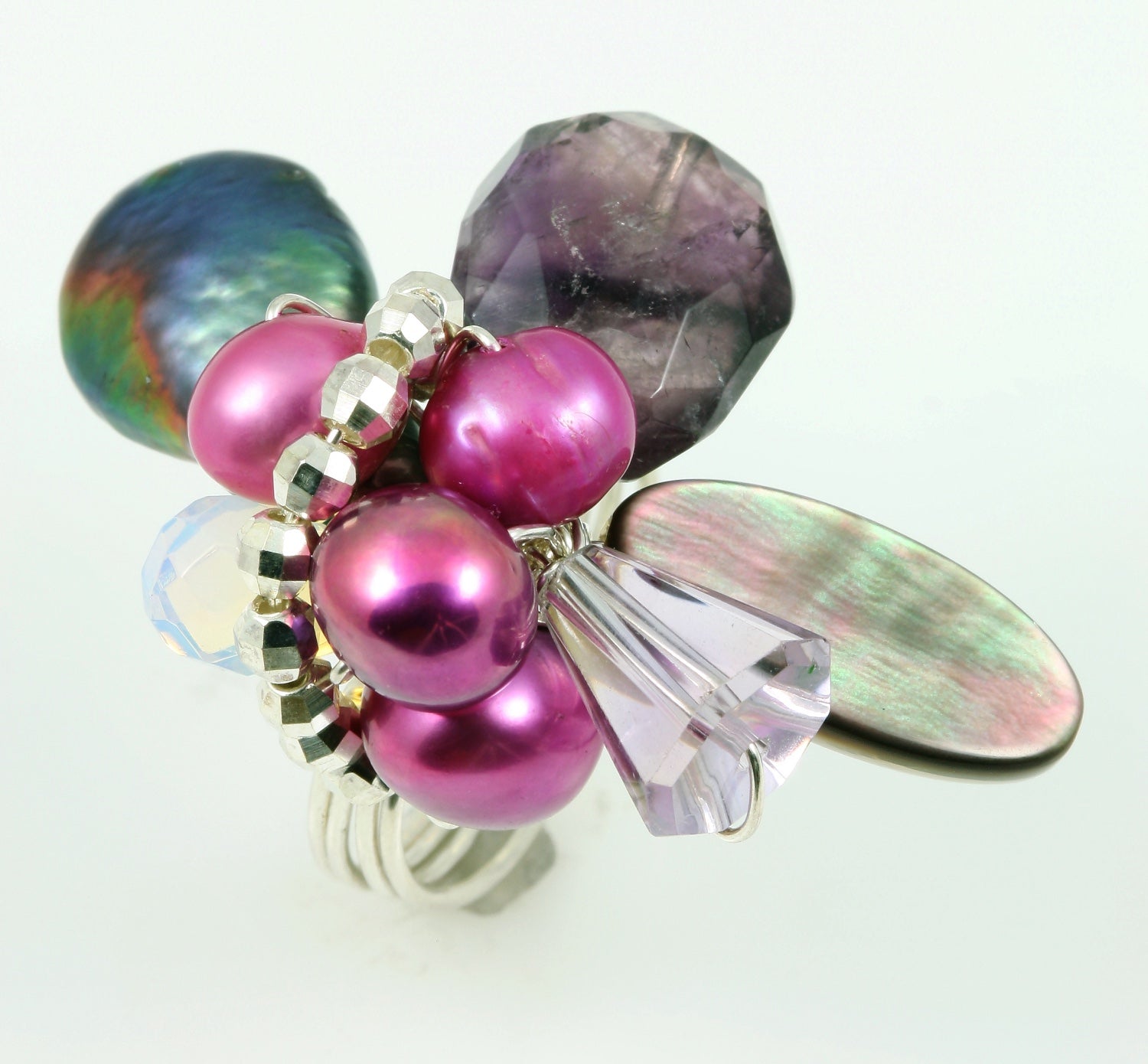 This contemporary ring features fresh water pearls, black amother of pearl, and Swarovski Crystal threaded on sterling silver. Lots of gorgeous pink, purple, and blue tones in this ring and its perfect for a beach holiday.