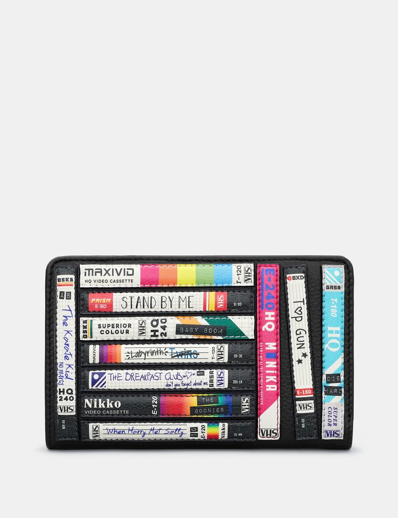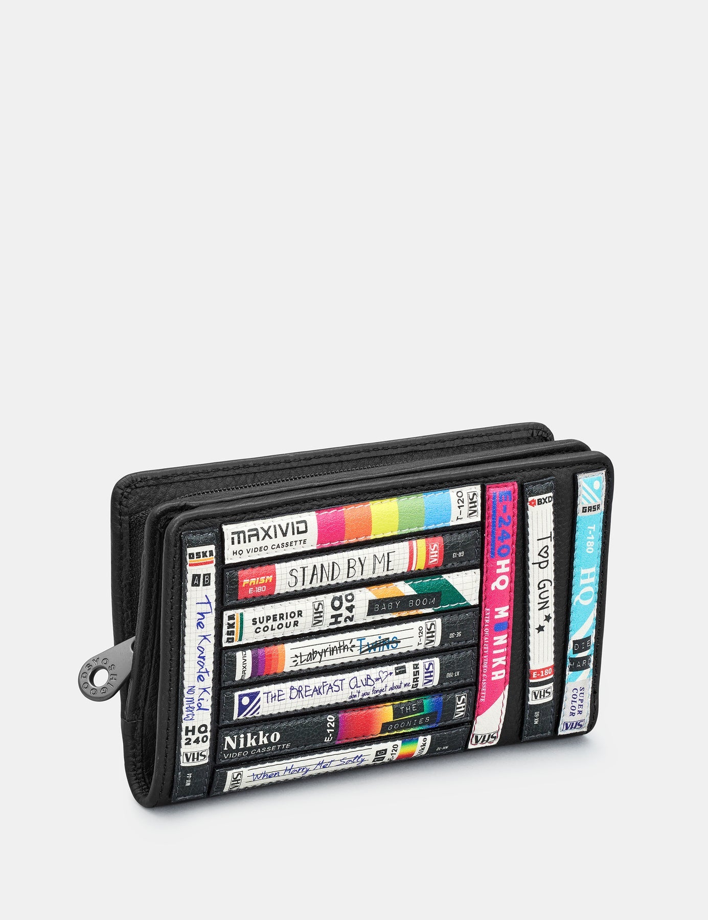 Time to get nostalgic with this flap over leather Be Kind Rewind purse for women. We have perfectly translated an assortment of VHS video cassettes and carefully handstitched them onto the front of this soft black leather flap over purse and there is plenty of room for cards, cash and coins.