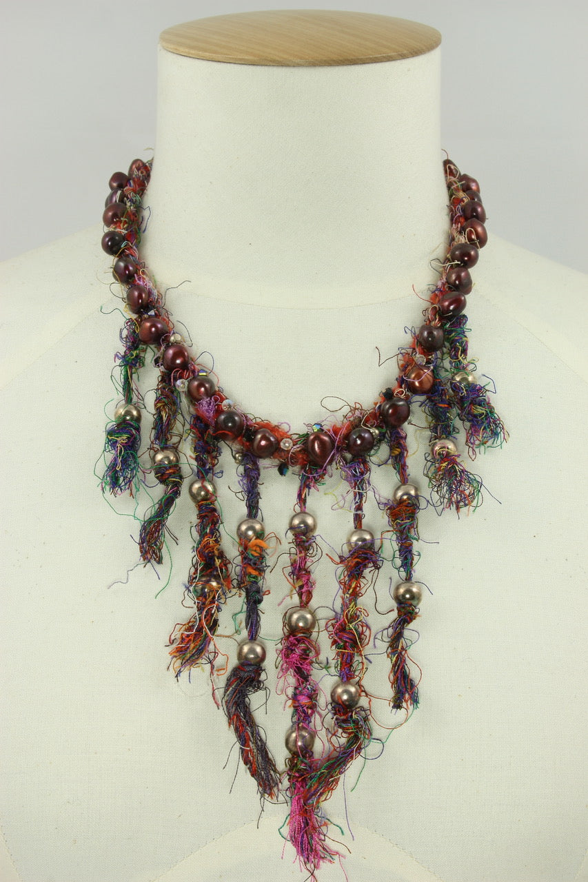 This bo-ho piece looks amazing on and is a fabulous statement piece. It features new and upcycled plaited (braided) fibres along with sterling silver beads and fresh water pearls. It has every colour under the rainbow in it so it will go with anything. You can wear it casually with a simple top or dress it up for going out. So versatile.