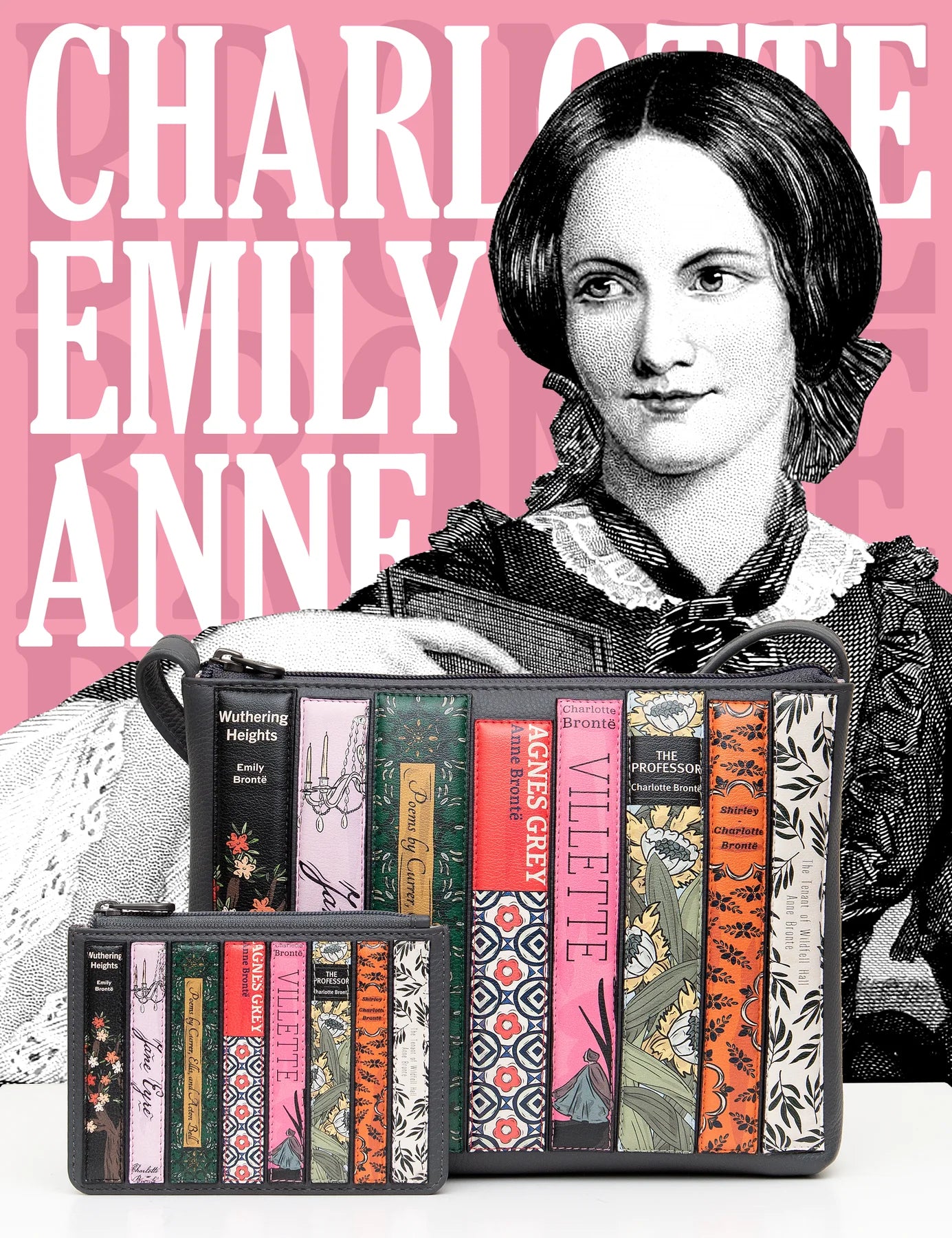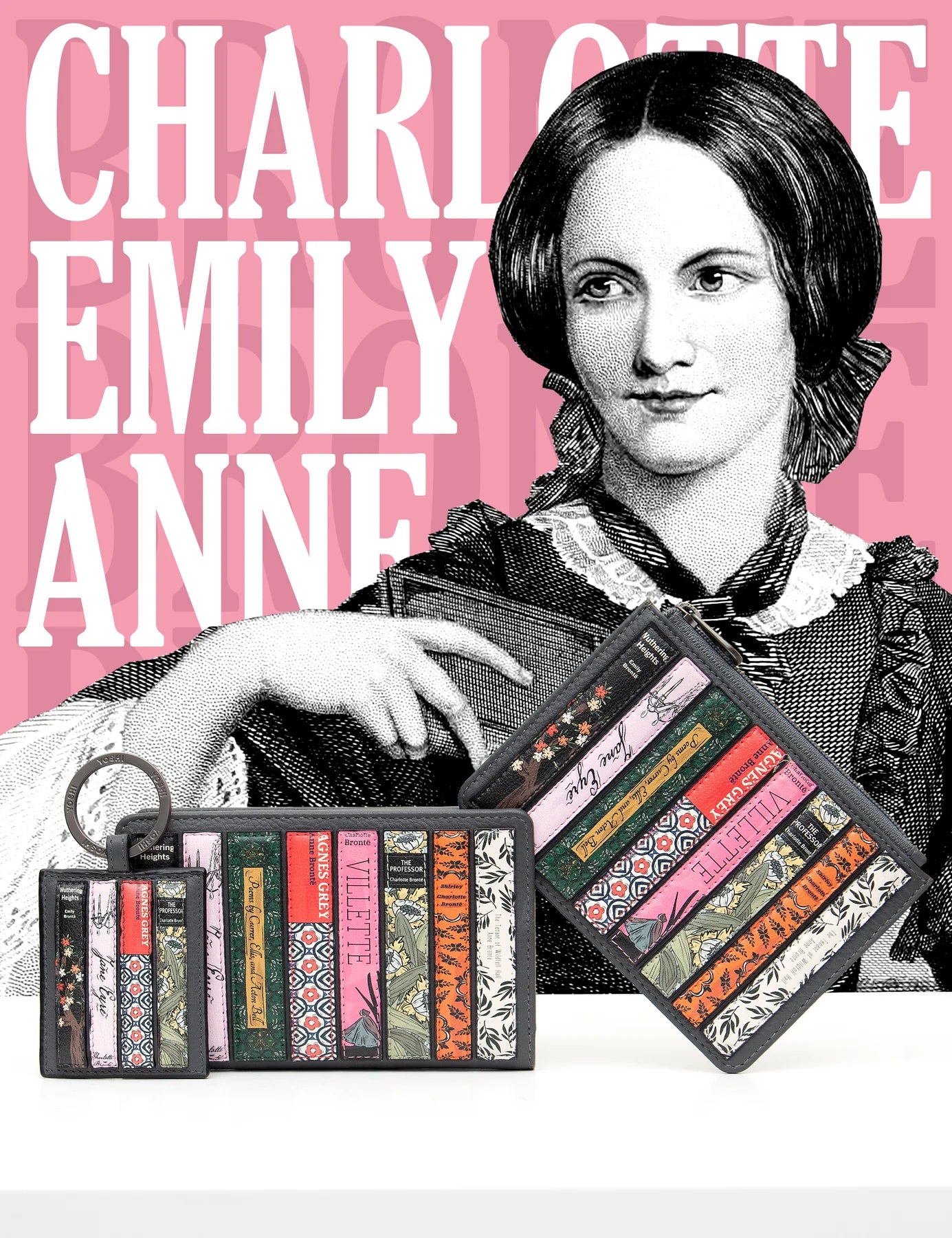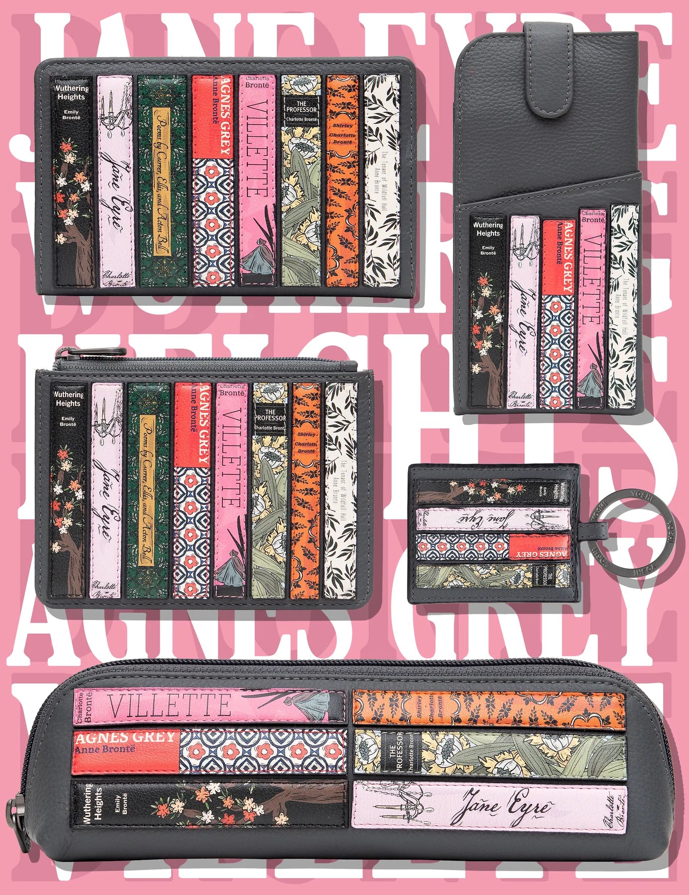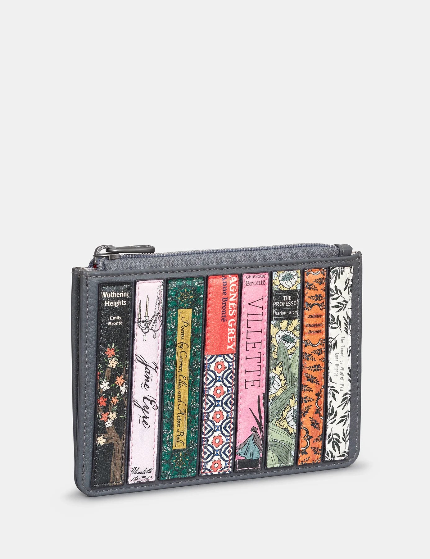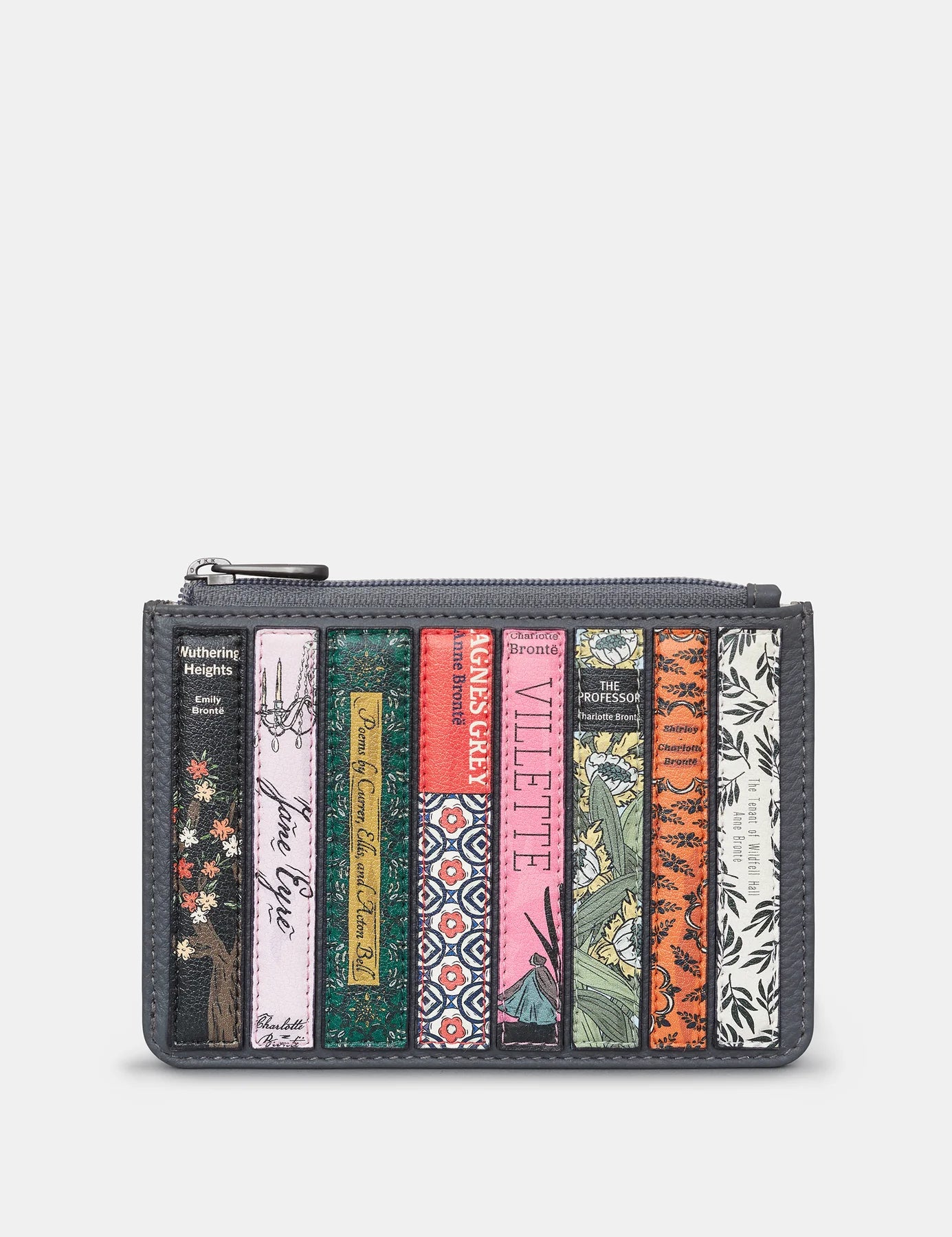 This slim leather purse for women honours the profoundly influential Brontë siblings; Anne, Charlotte and Emily. Three women who changed the face of literature with their passion, originality and intrepid spirit. With themes of love, independence and revenge heavily present amongst their novels and poetry the principal colours had to be dark and moody whilst still graced with significant bursts of boldness which compliment the grey leather. This leather purse has a zip top fastening and a very handy credit card slot on the outer and credit cards will also fit in the zip section. RFID protection is also included as standard for your peace of mind and the front features titles such as Jane Eyre & Wuthering Heights.