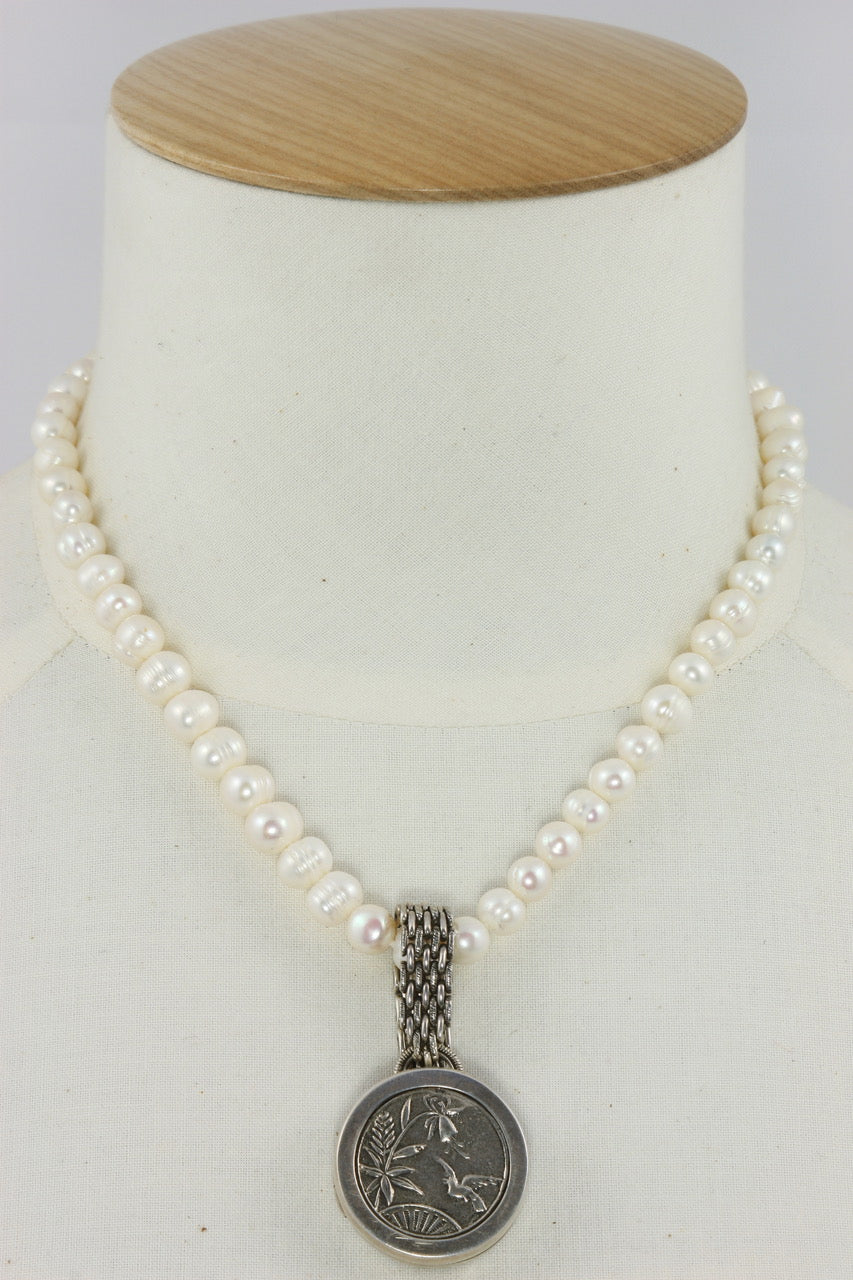This piece is very versatile and can be worn easily on a chain but also on a strand of pearls or stones. The bail is of large diameter and will fit over a strand of beads or pearls 12 millimeters in diameter.