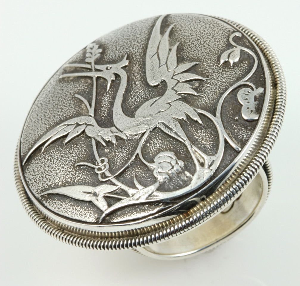 This is a stunning ring and features a crane taking flight and is cast from a vintage medallion.