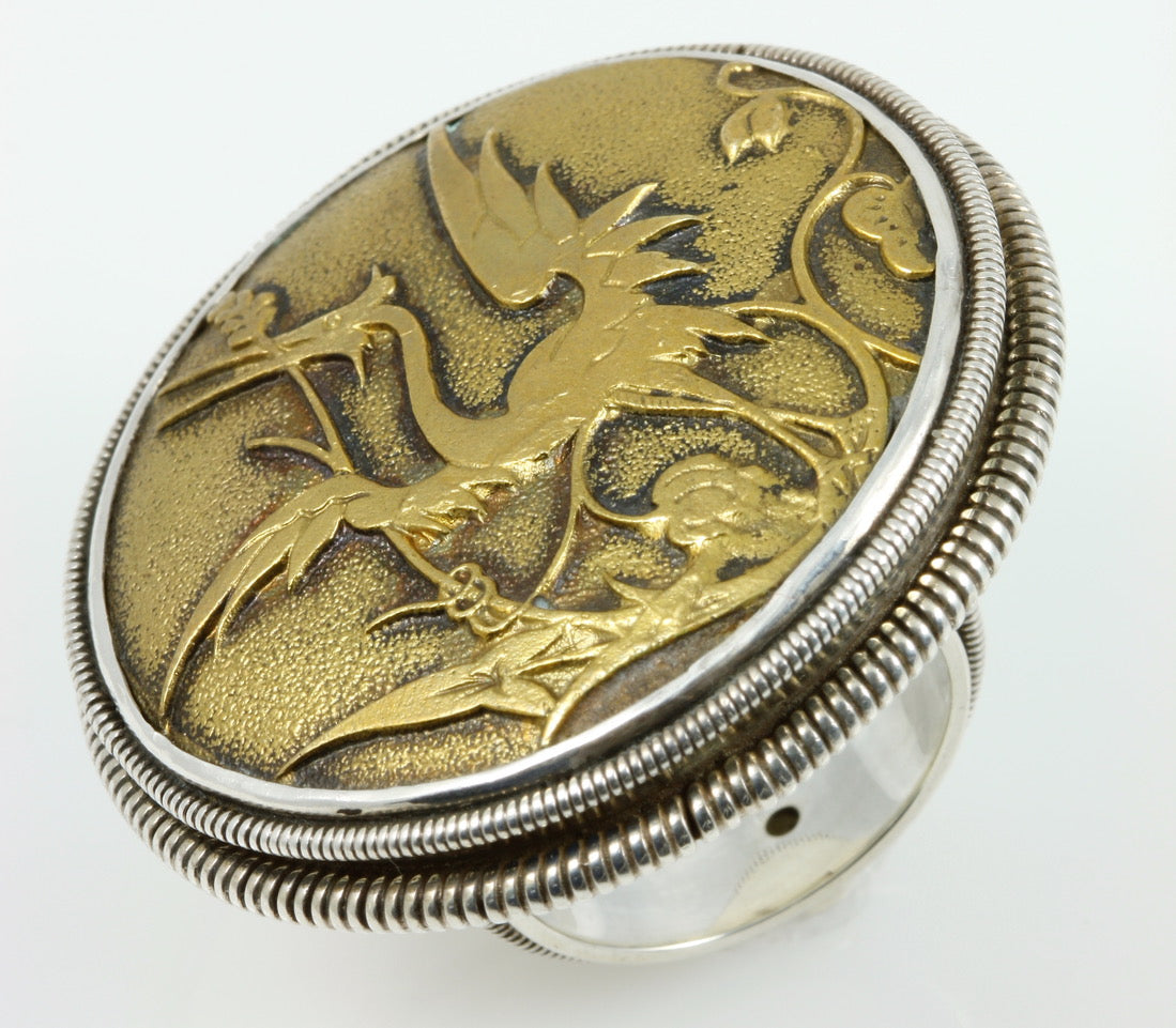 This is a stunning ring and features a crane taking flight and is cast from a vintage medallion.