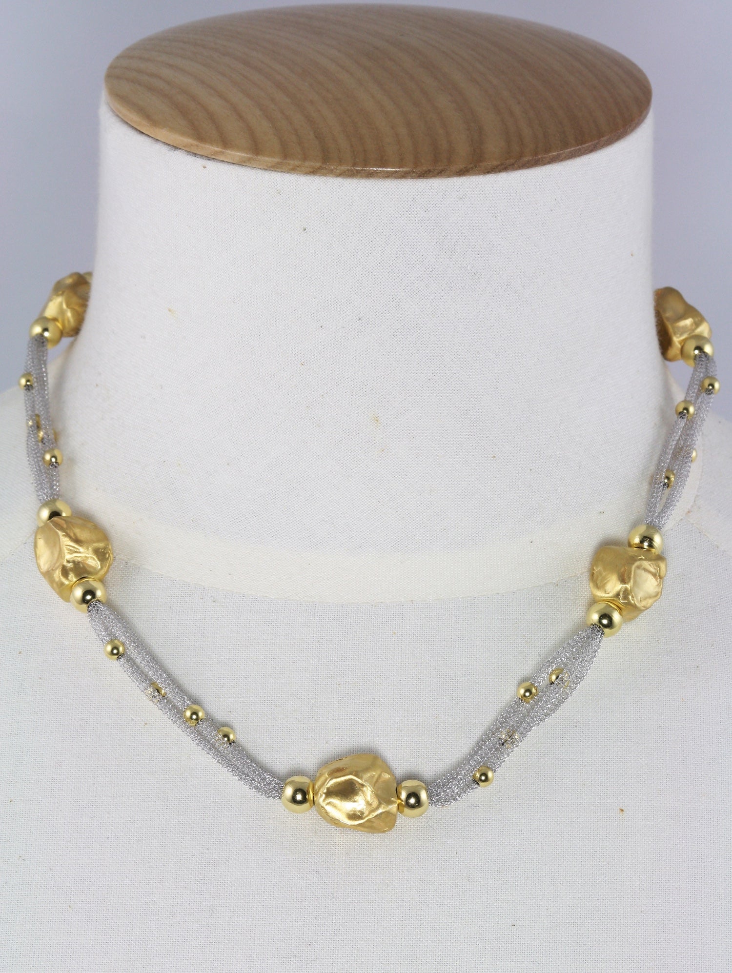 This beautiful necklace features two strands of knitted sterling silver wire held together by gold plated sterling silver nugget shaped beads. This is a timeless piece and will be a cherished item in your wardrobe.