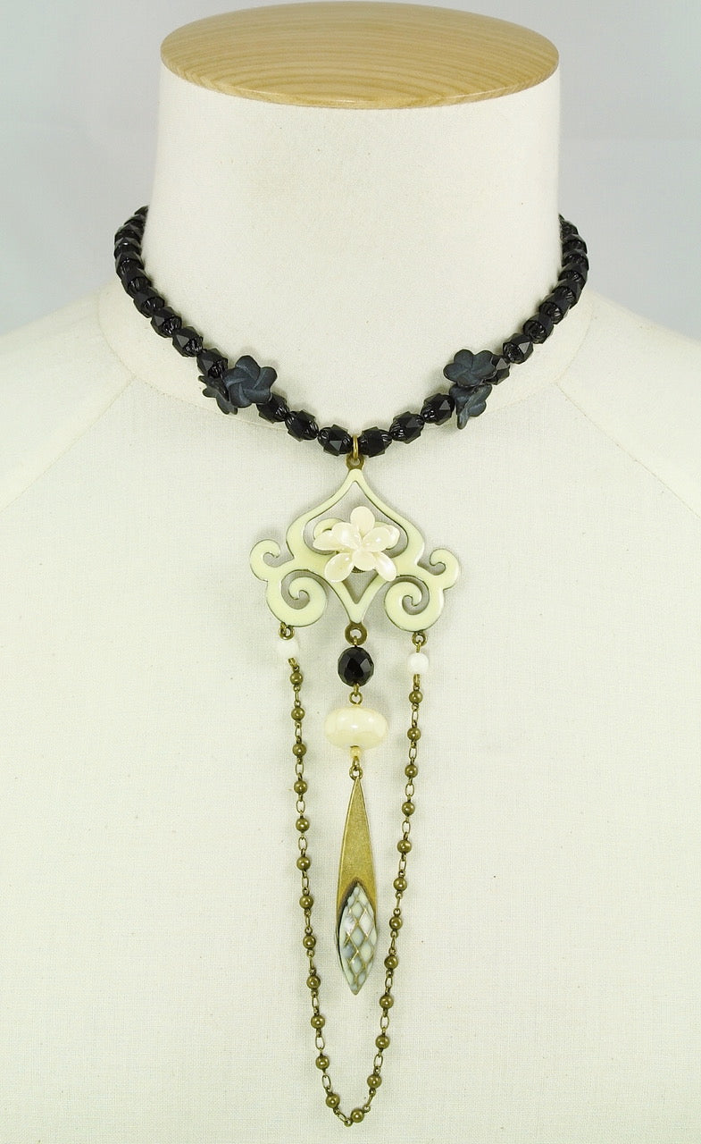 This one is a work of art and love. Claudine Vitry's work often incorporates vintage elements and this piece is no exception with black vintage beads throughout. She also adds enamel to her custom designed metal elements. A cream porcelain flower adorns the central pendant and dropping from that is a beautiful lampworked glass bead and more enamelled metal elements. The overall effect is jewellery as individual as you. One of my absolute favourite pieces.
