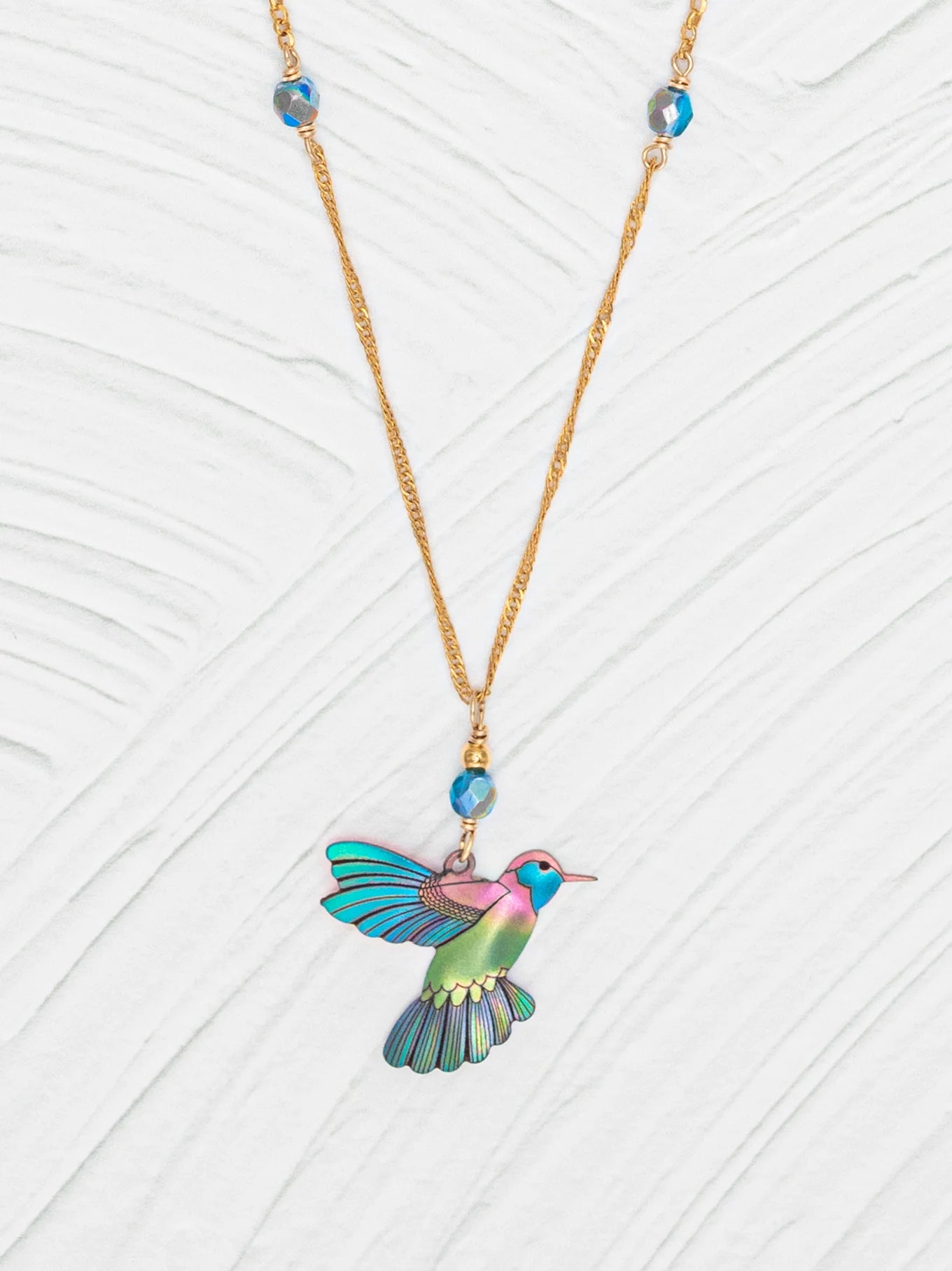 Hummingbirds have long been regarded as symbols of luck and messengers of love. Quick as a flash, it's not likely you'll see one perched or sitting still. Their infinite energy is an inspiration, as is their vivacious palette of colors. Niobium's radiant glow brings extra definition to their feather's striking hues, making this pendant a treat for the eyes and a treasure for the heart.