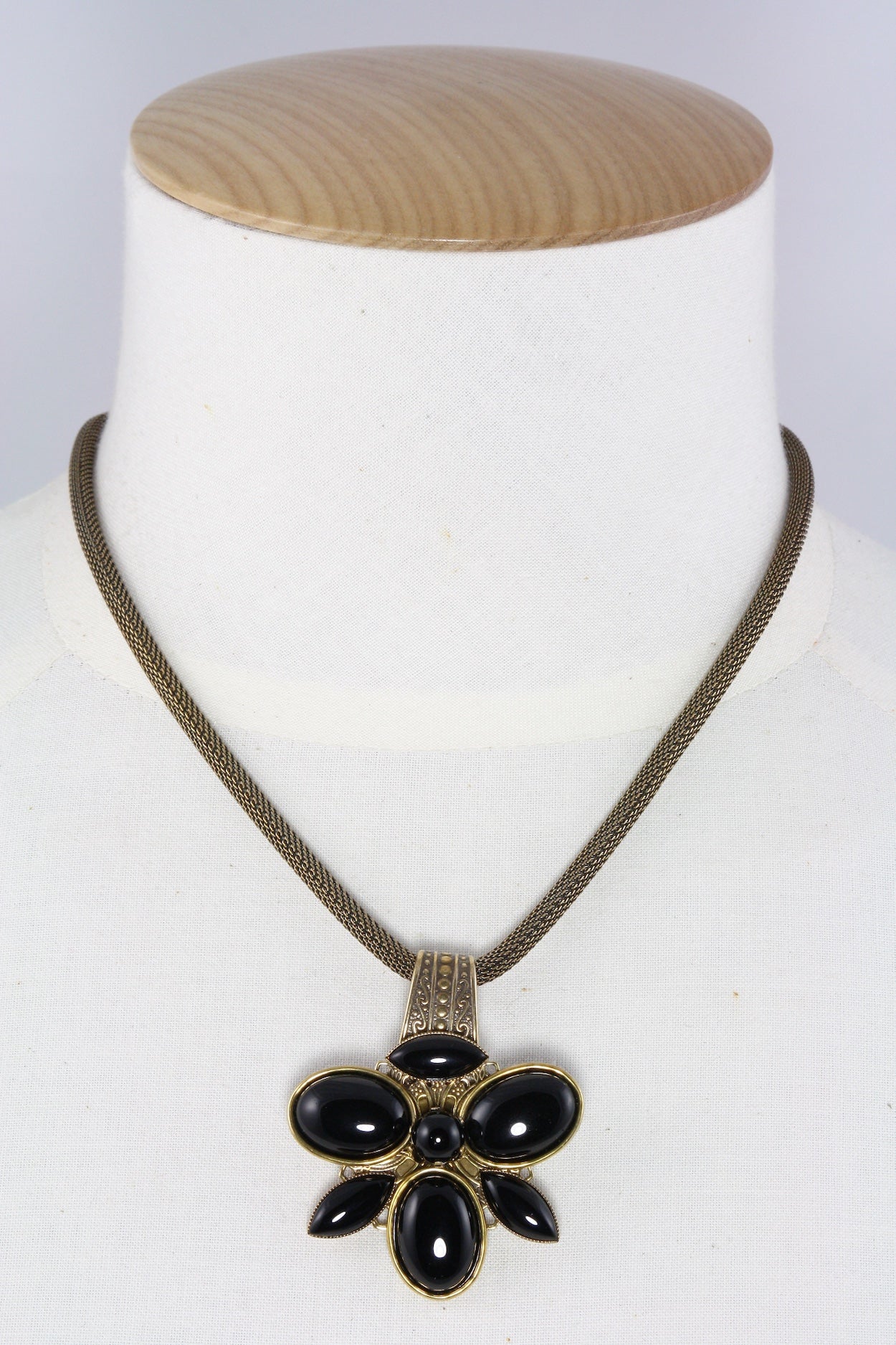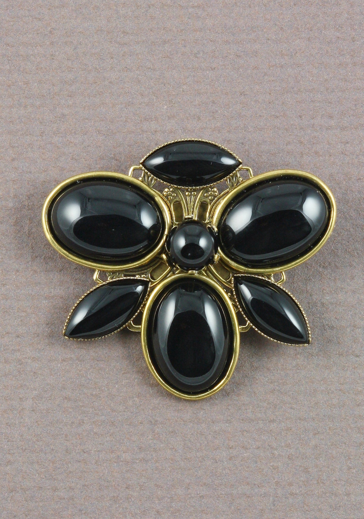 Jan Michaels was a hugely successful jeweller and we carried her work for many years. She has recently retired and we have a few remaining pieces of her beautiful work. This brooch is certainly one of them. It features antiqued brass with black onyx stones. (With the addition of a wee converter this can be worn as a pendant.)