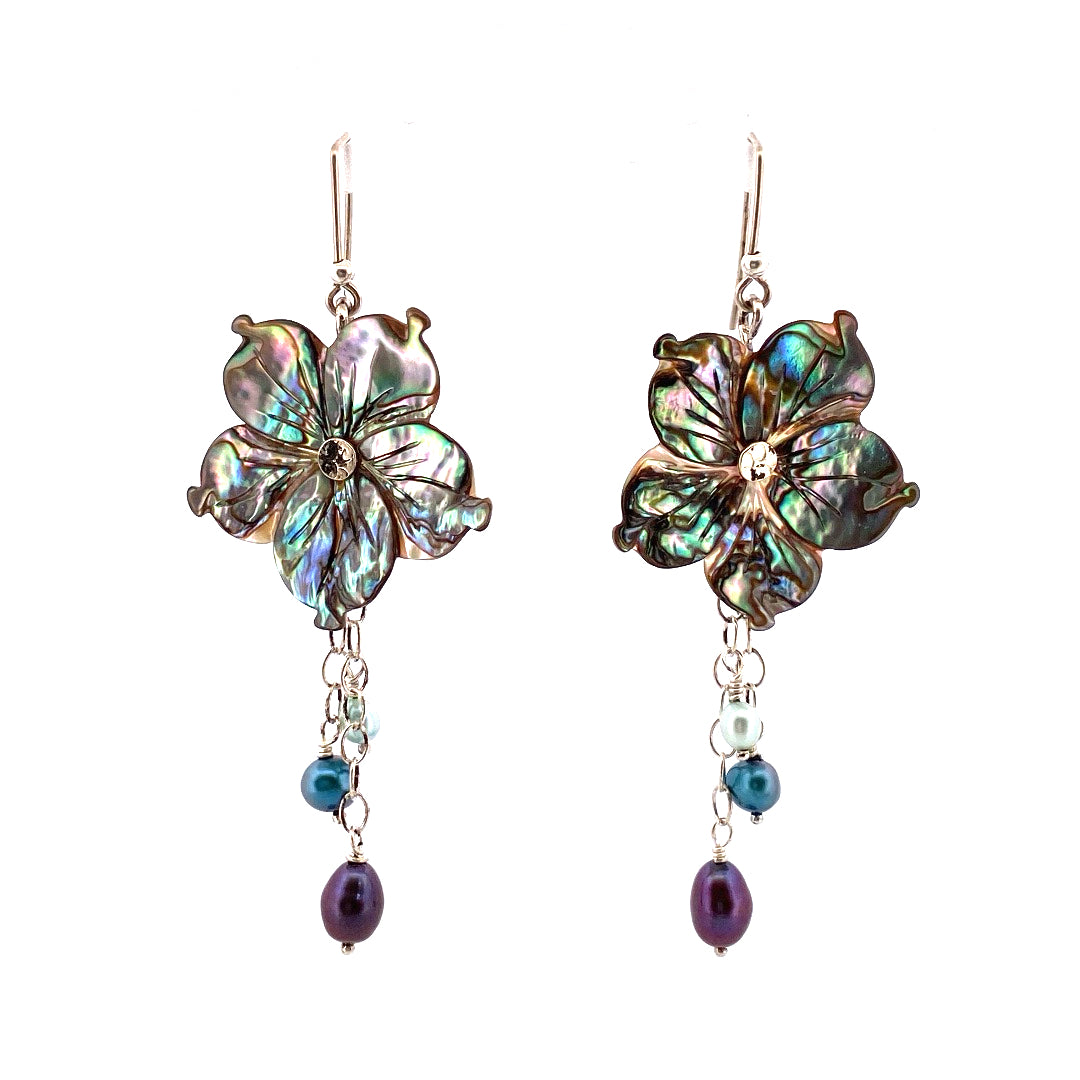 Kathleen Robins Jewellery Design Carved Paua Flower Earrings With Pearl Drops