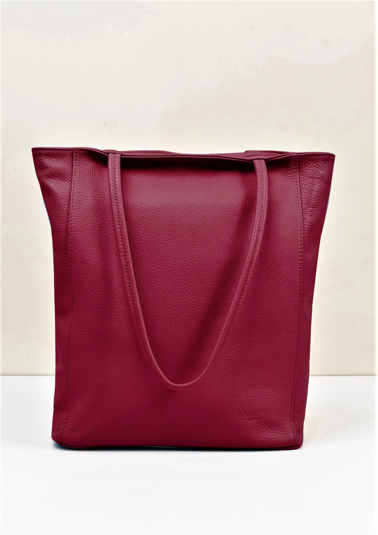 Our tall and elegant leather tote adds contemporary, understated style to any outfit and is very spacious. The pebbled textured Italian leather is seriously soft and lightweight. There is an internal leather pocket for your mobile or keys and another internal side zip pocket plus an external zip pocket on reverse side.