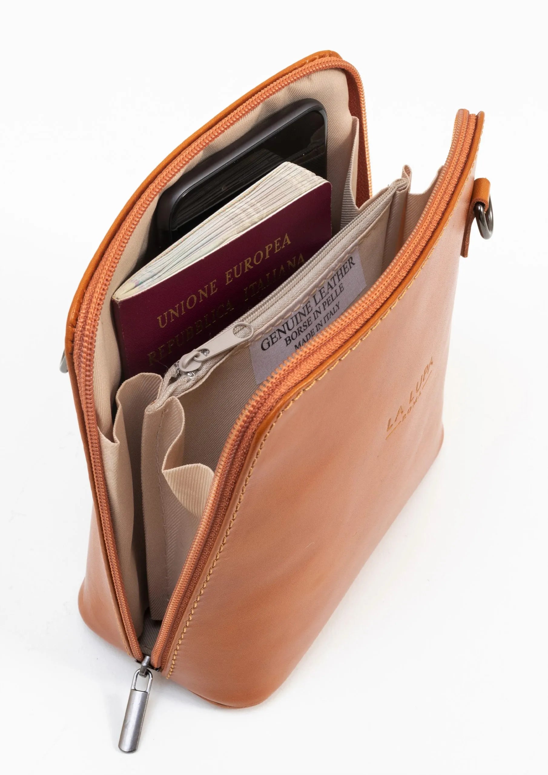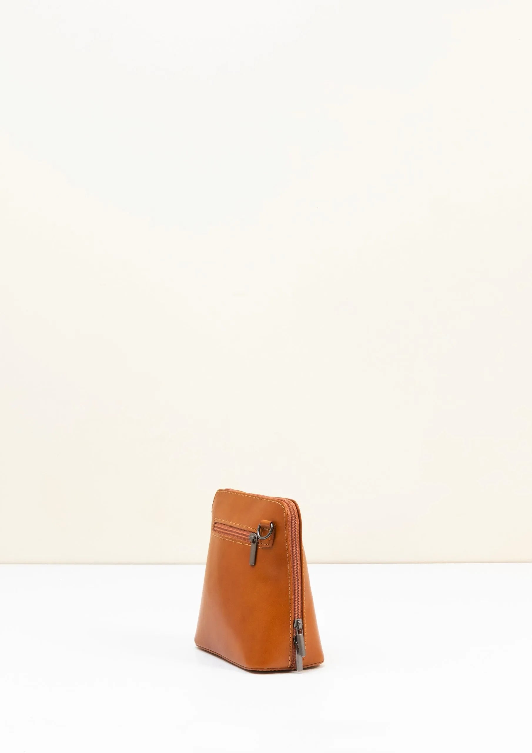 The Rachele is handcrafted in smooth Italian leather with a strong base which provides a smart structure to the bag. It features all around zip closure and opens the bag up wide to a fully lined compartment with a zip pouch to keep your small items in place. The wider base allows a mobile up to 17cm-long to slot in horizontally.