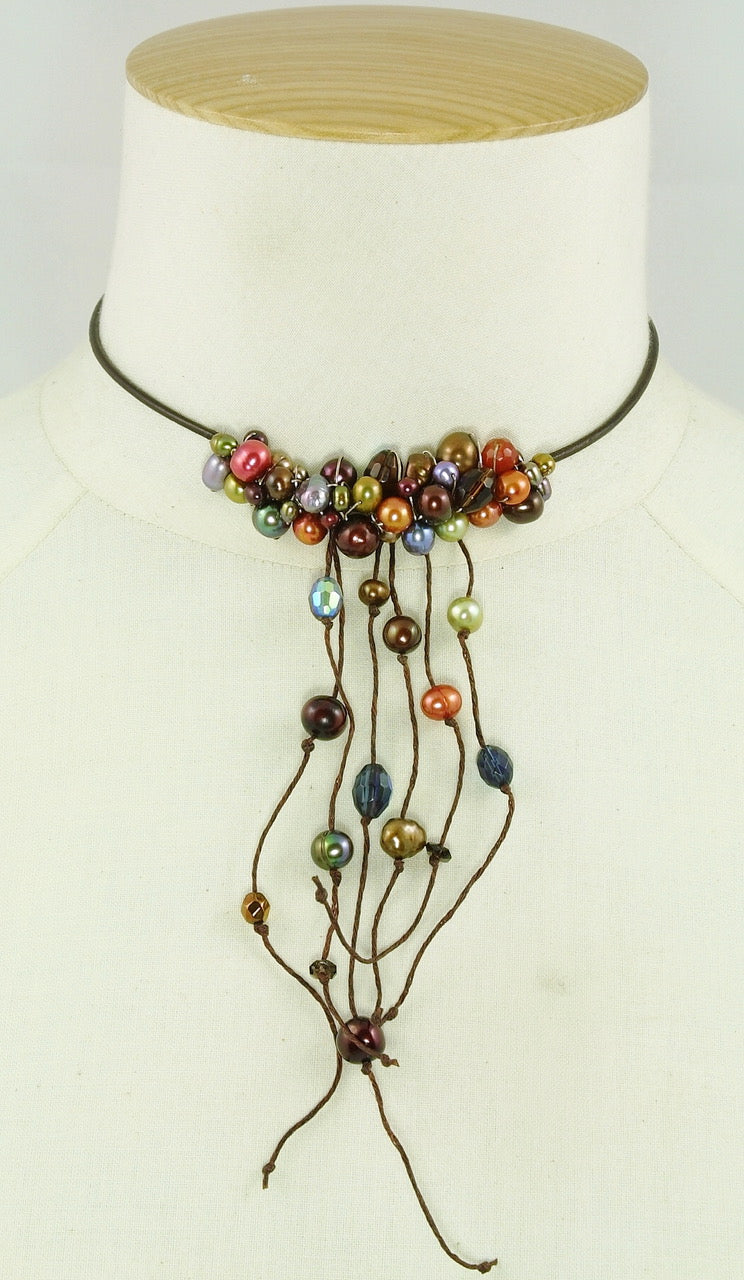 This contemporary necklace on leather features fresh water pearls threaded on multi dangling strands. Lots of gorgeous colours make this necklace so very versatile.