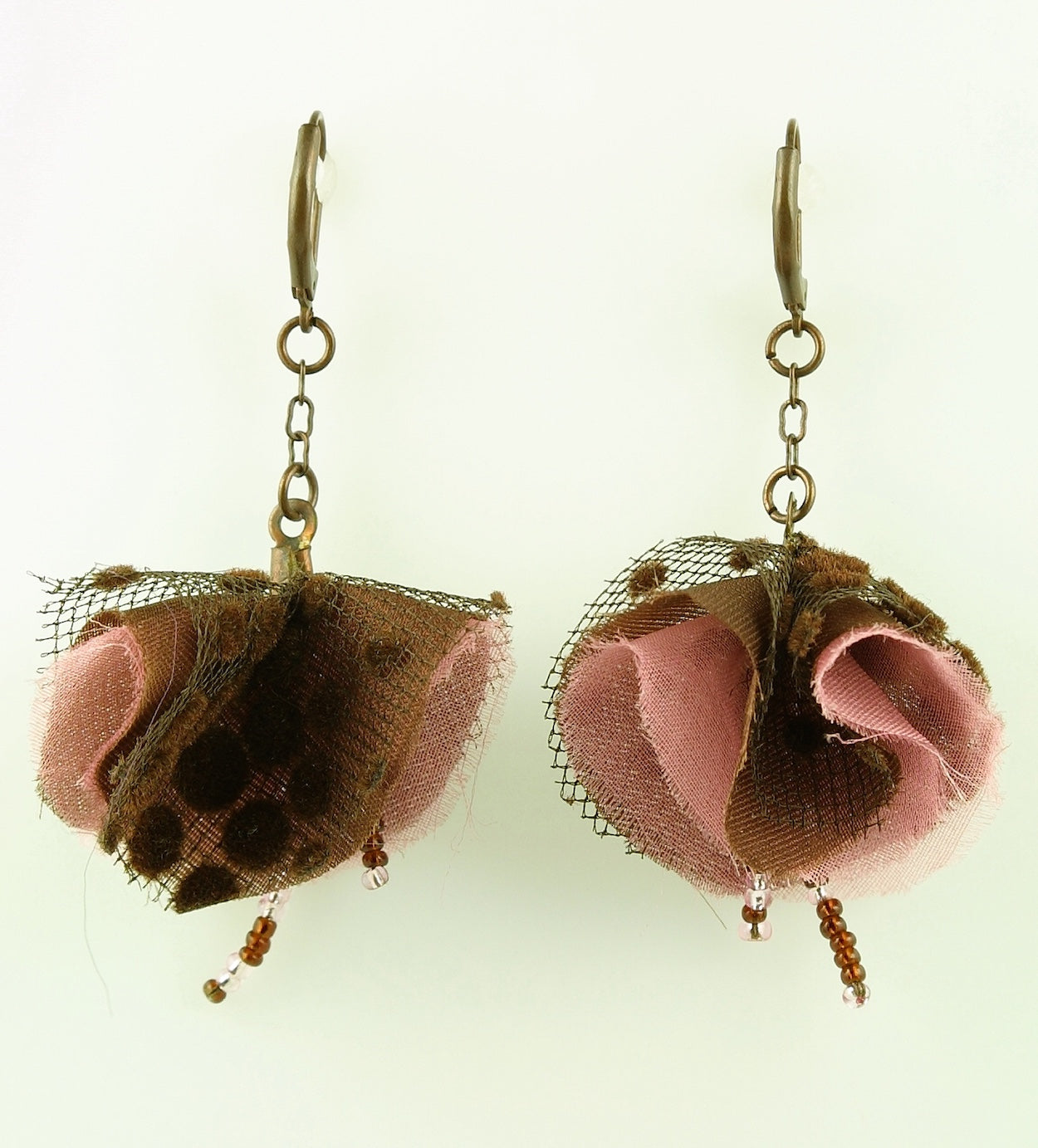 Haute Couture Hat and Accessories Designer Johanna Braitbart has crafted these beautiful earrings featuring gorgeous textiles that are layered and then combined with glass beads. These are a wonderfully feminine earrings.