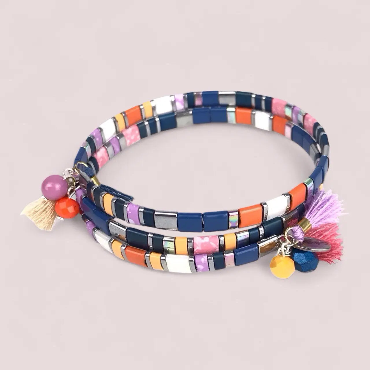 Handmade bracelet with dyed hematite on a memory steel base, vibrant and classic colors combined in harmony.Very easy to put on, with handmade crystal pendants and cotton and silk tassels. Wrap-around two-turn bracelet.