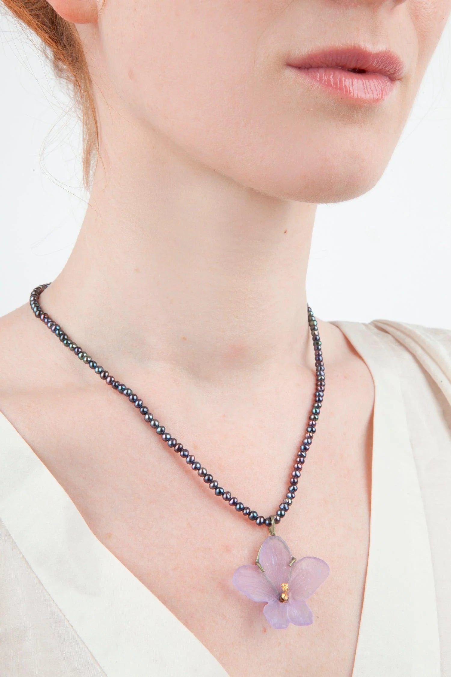 Materials: The African Violet is cast in pale purple glass with a 24kt gold plated bronze centre on peacock freshwater pearls.