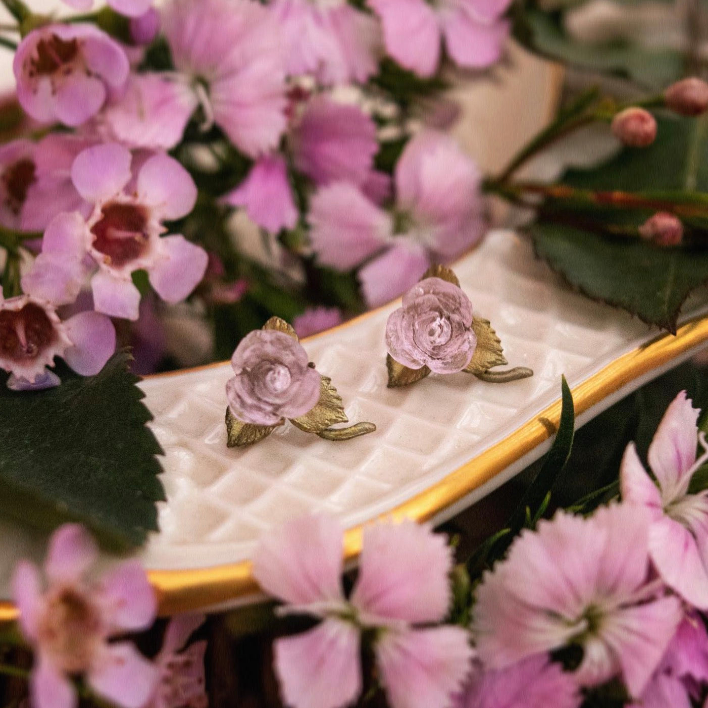 Materials: The Blushing Rose earrings are cast in hand patinated bronze with cast pink glass roses. The posts are 925 silver.