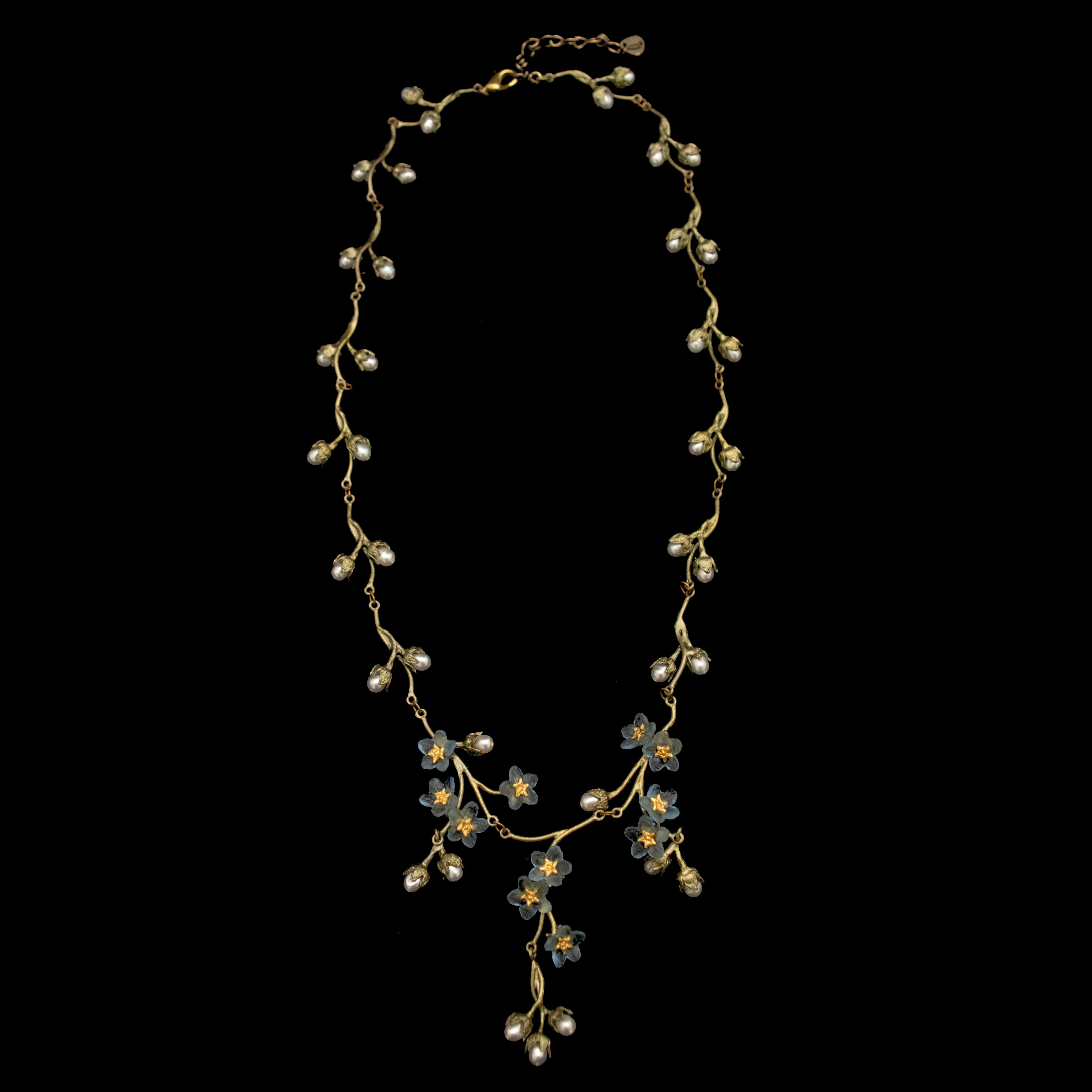 Materials: The Forget-Me-Not necklace is cast in hand patinated bronze with white freshwater pearls and pale blue glass flowers.