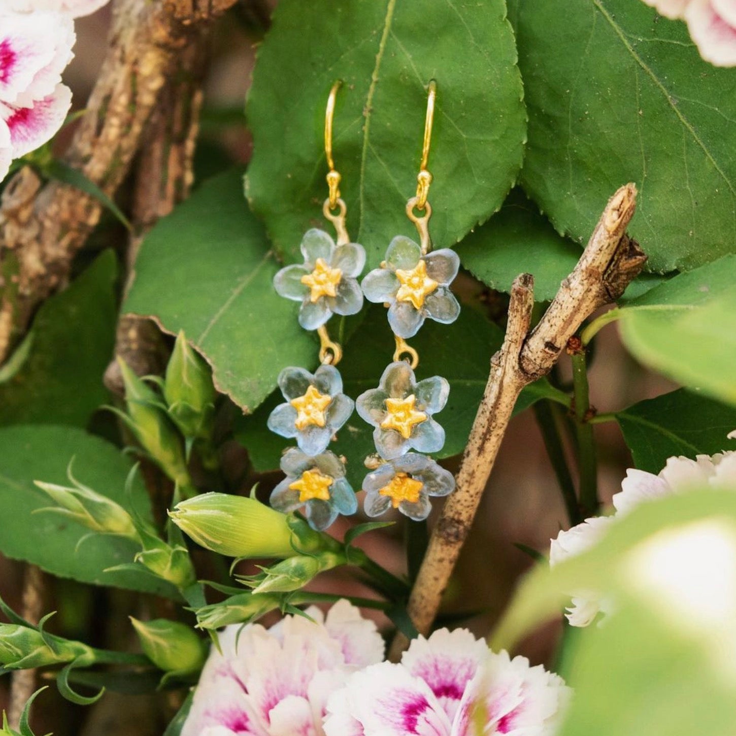 Materials: The Forget-Me-Not earrings are cast in hand patinated bronze with pale blue glass flowers. The wires are 925 Sterling Silver.