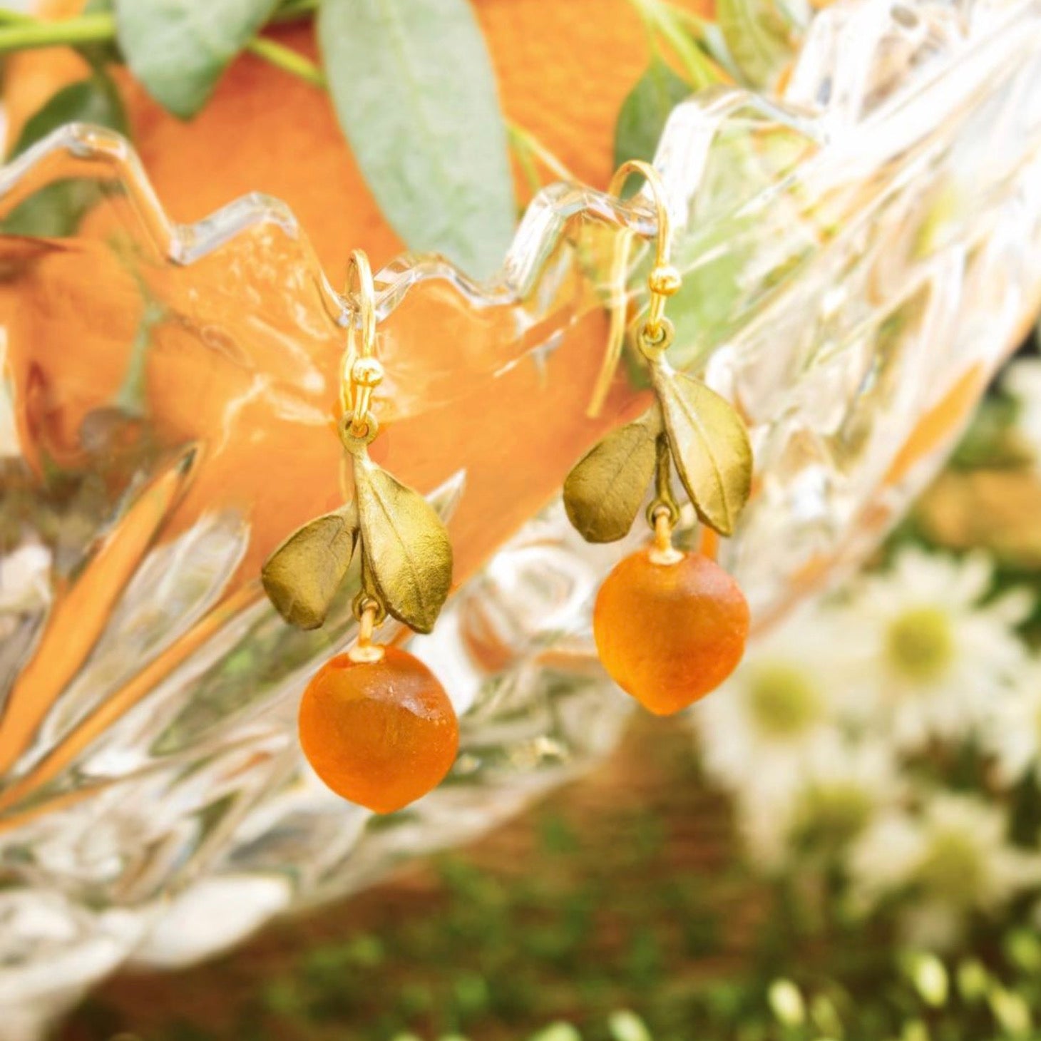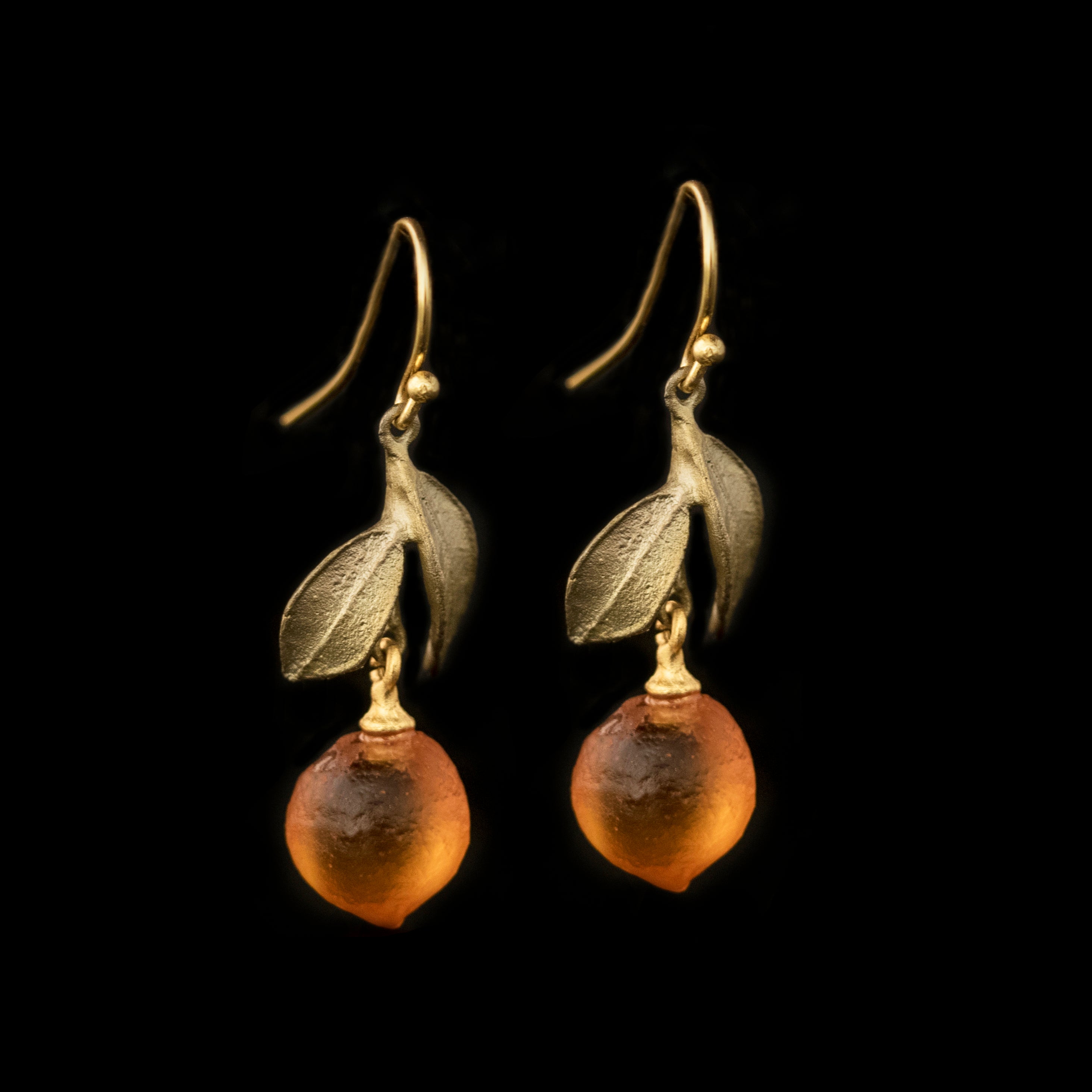 Materials: The Orange earrings are cast in hand patinated bronze, accented with cast glass oranges. The wires are 24kt gold over 925 silver.
