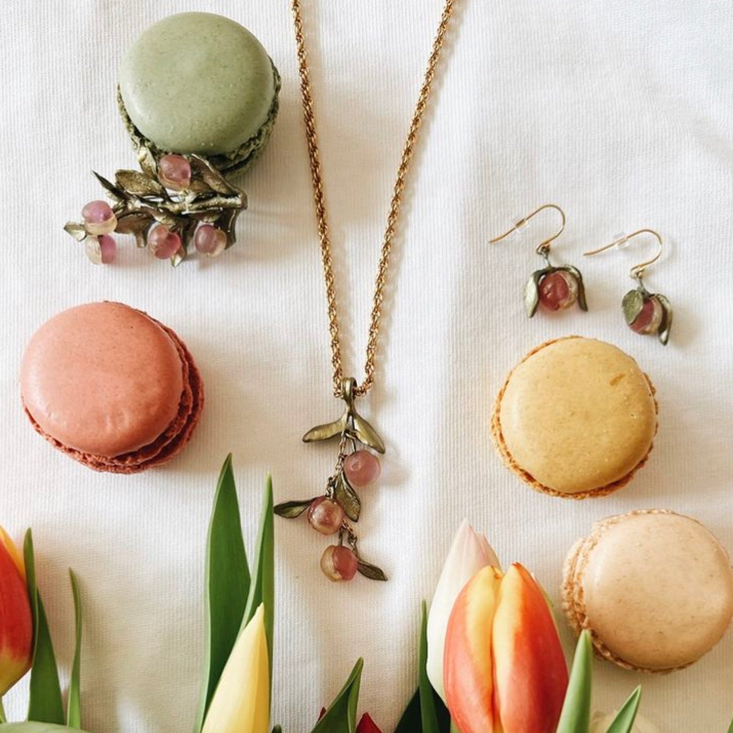 Materials: The leaves and twigs of the Peach Tree earrings are cast in green hand patinated bronze. The earrings are accented with cast glass peaches in pale pink and yellow. The wires are 925 Sterling silver with a 24kt gold plating.
