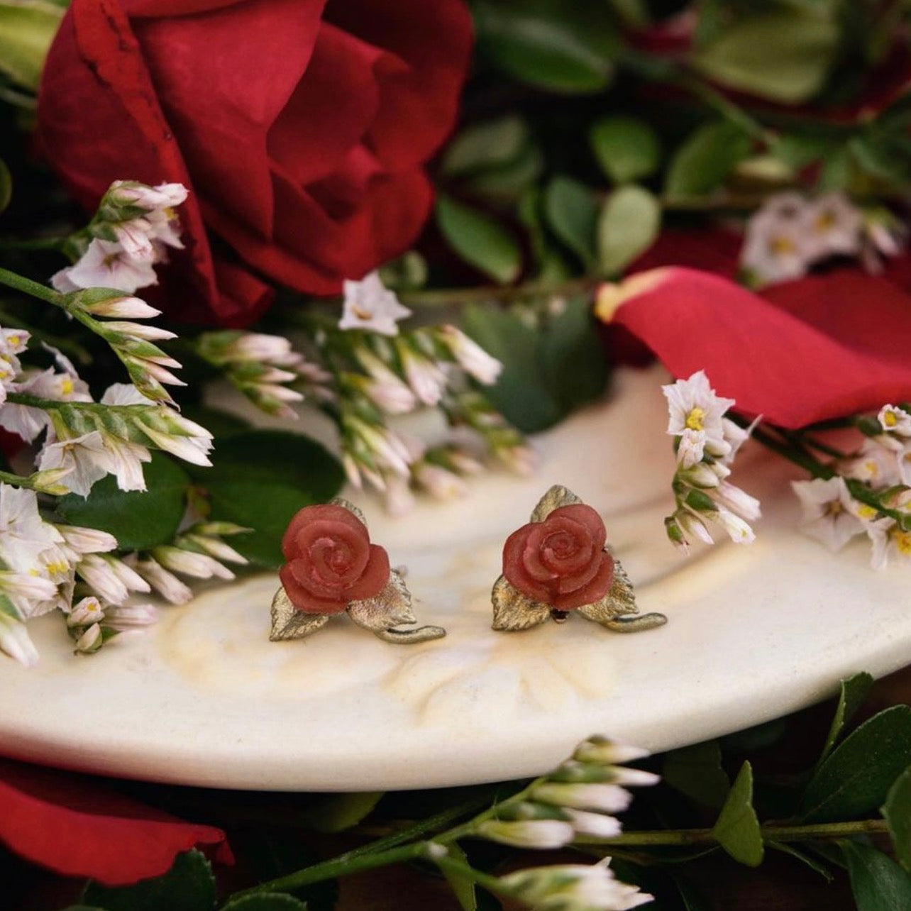 Materials: The Blushing Rose earrings are cast in hand patinated bronze with cast pink glass roses. The posts are 925 silver.