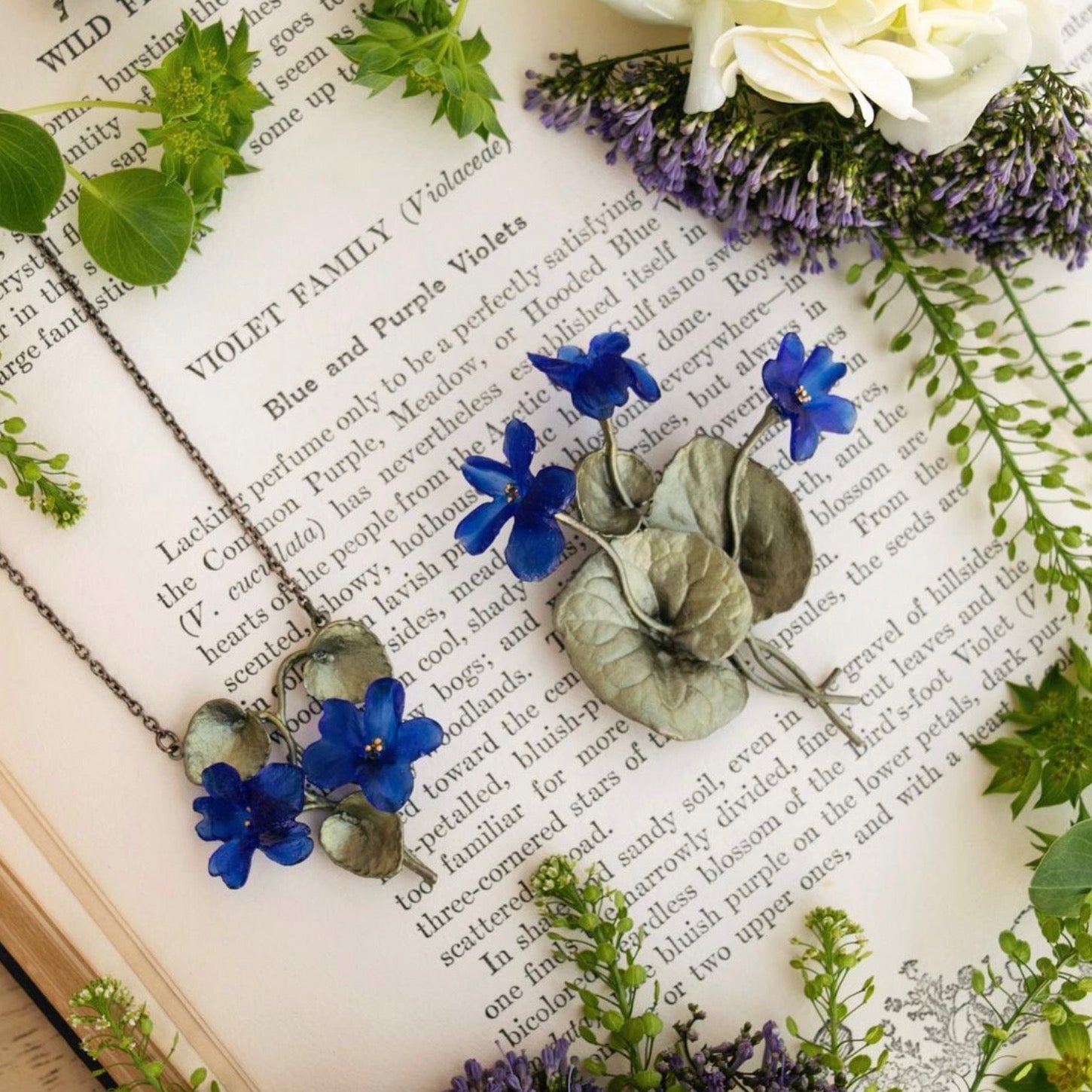 Materials: The Wild Violet pendant necklace is made of cast bronze with a hand patina finish and cast glass flowers.