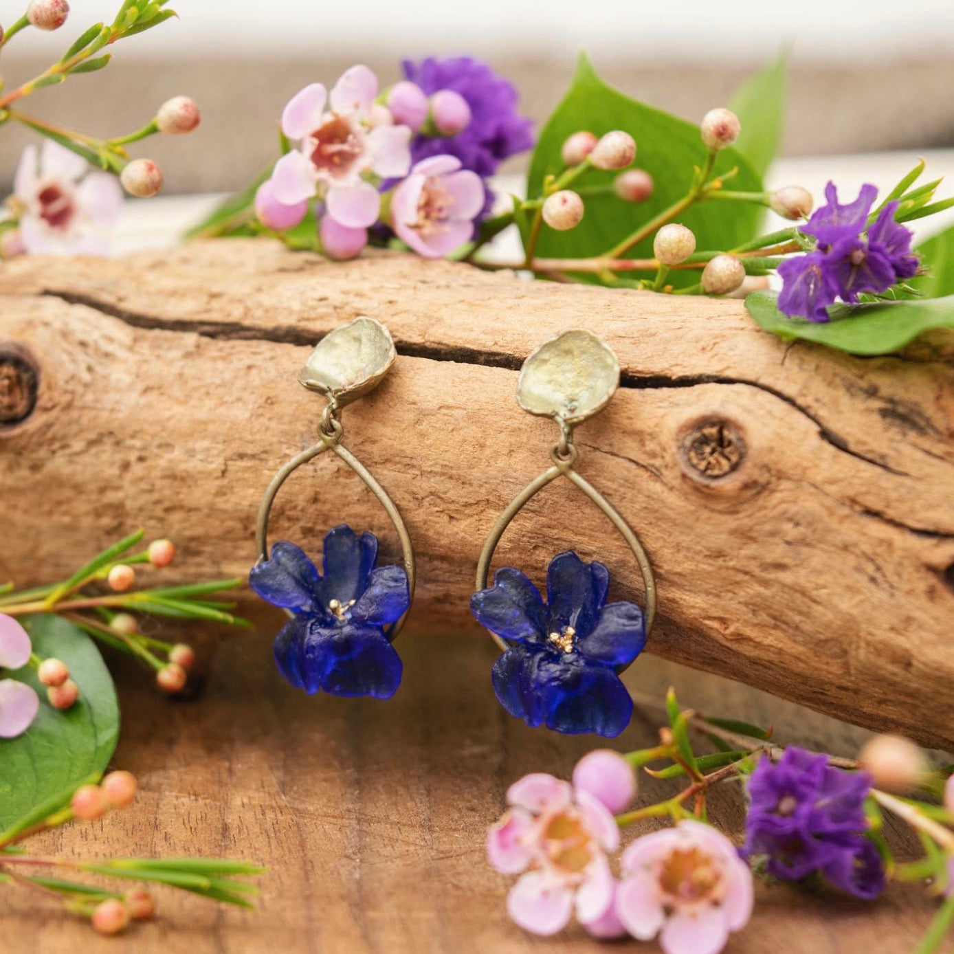 Materials: The Wild Violet post earrings are made of cast bronze with a hand patina finish. They are accented with cast glass and a patina finish. The posts are 925 silver.
