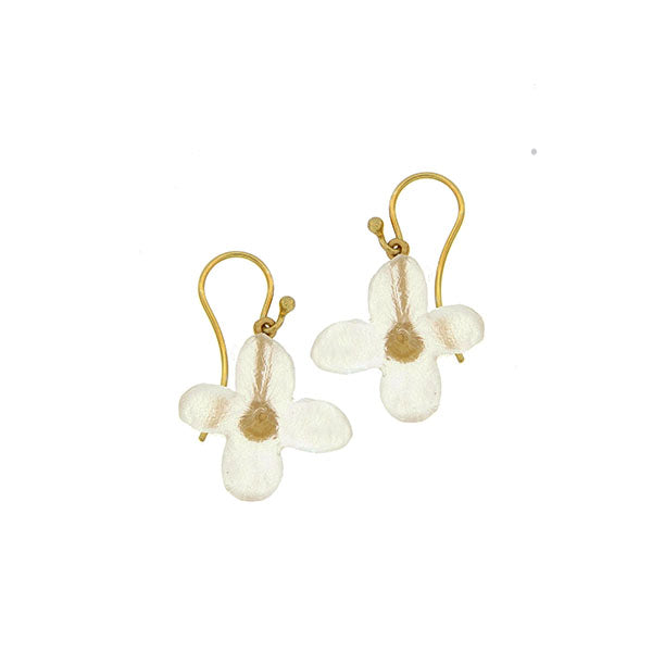 Materials: The Hydrangea Collection is cast in bronze layered in 24K Gold with cast white pearl glass elements. Sterling silver ear wire, layered in 24K Gold.