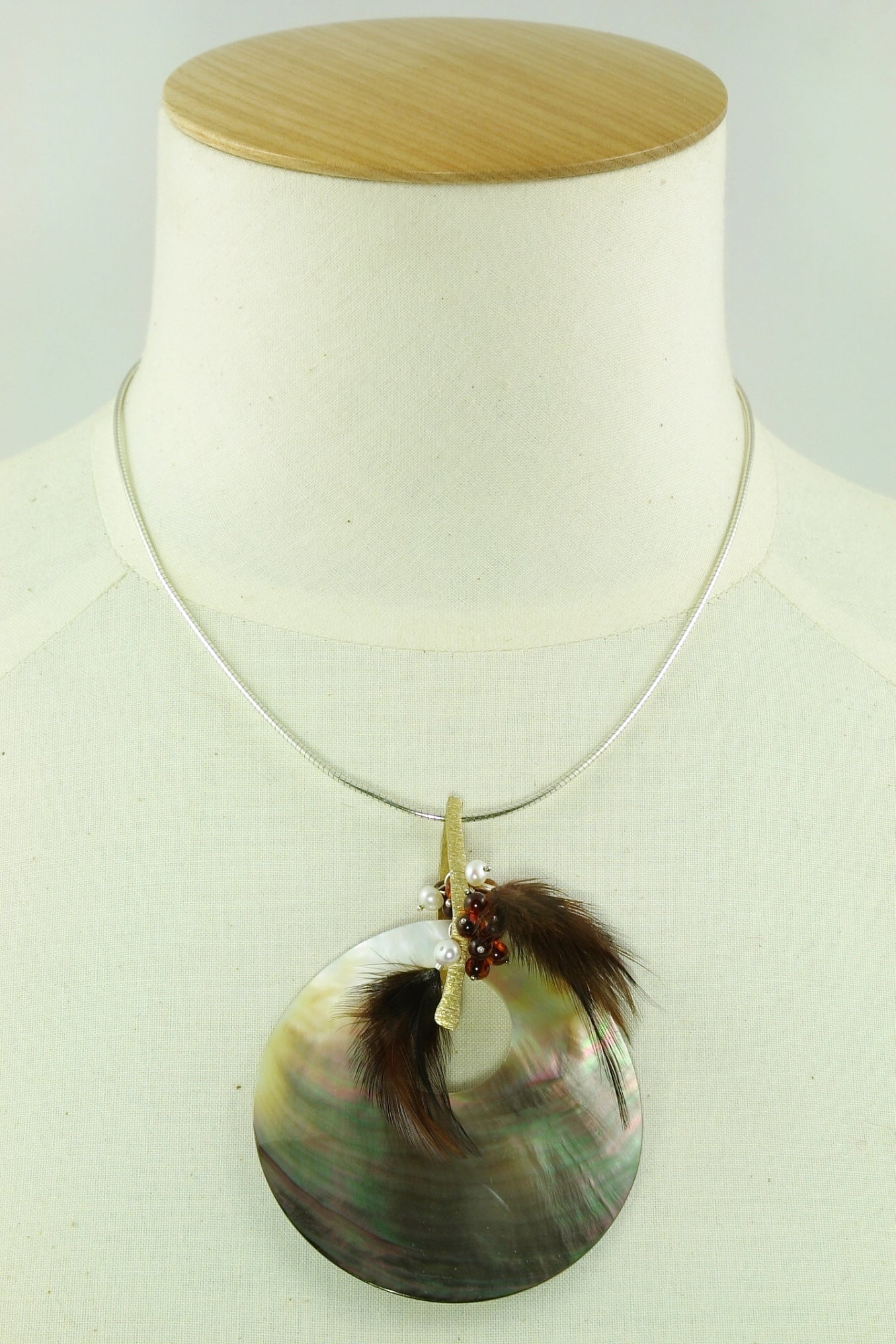 This Polish designer piece features a beautiful piece of handcarved mother of pearl accented with amber beads and feathers. It also contains a textured gold-plated sterling silve central feature. (chain not included) The colours in the mother of pearl are stunning and are not done justice in a still photo. Please contact us if you would like a video clip to show the interplay of light on the mother of pearl.
