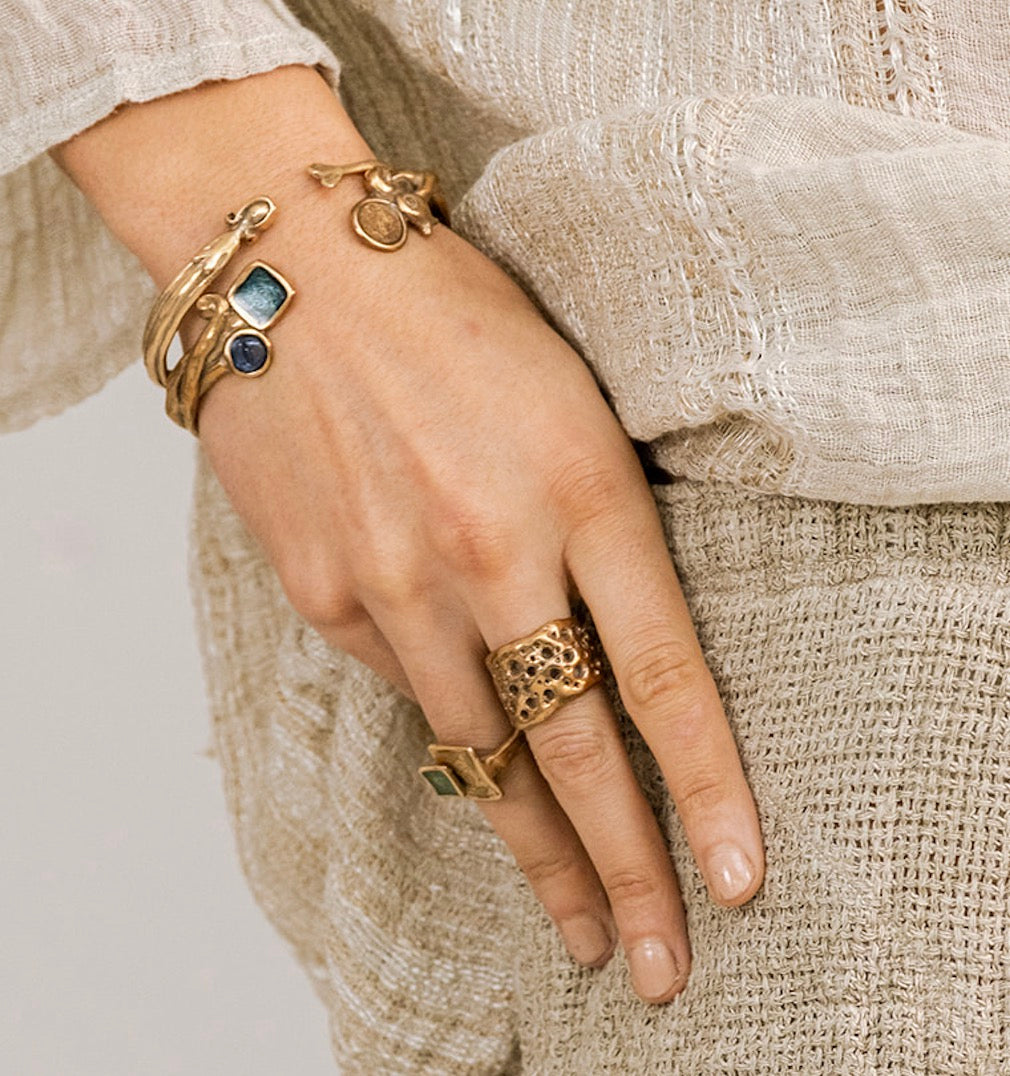 The Pesci Che Volano jewellery collection is handmade using the ancient lost-wax casting method in a small atelier in Florence, Italy. This collection of statement rings, earrings, bracelets and pendants features bronze creating an ornate, yet understated style. Unique symbols are hand carved into each individual piece while irregularities and imperfections ensure no two designs are exactly the same.