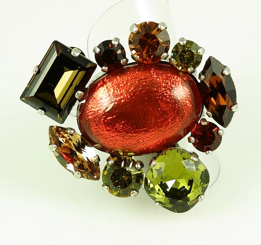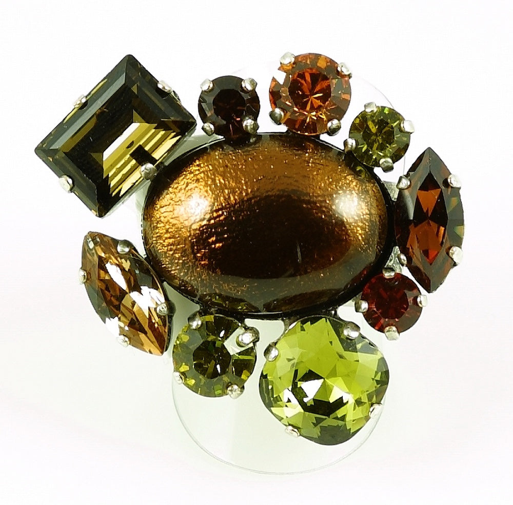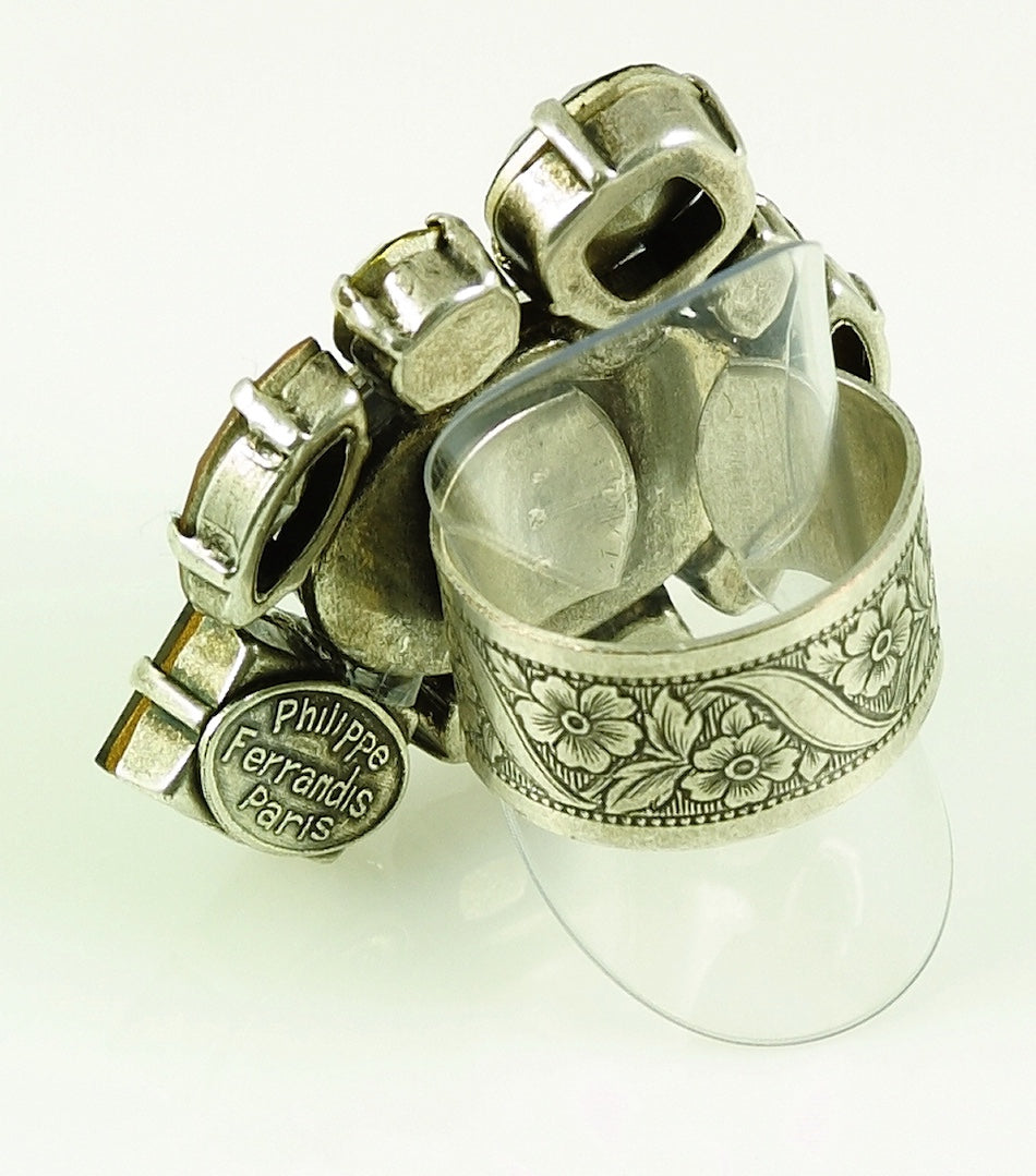 Haute Couture French Designer Philippe Ferrandis Has been designing high fashion jewellery since 1986. This bold statement adjustable ring features genuine Swarovski Crystals and a glass cabochon.