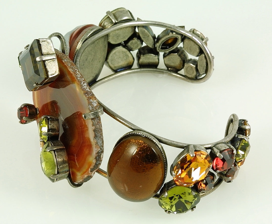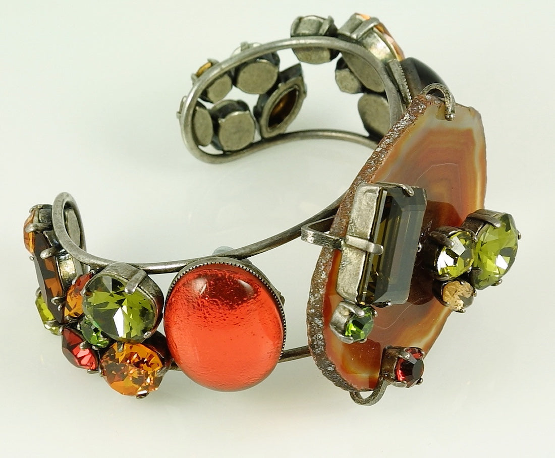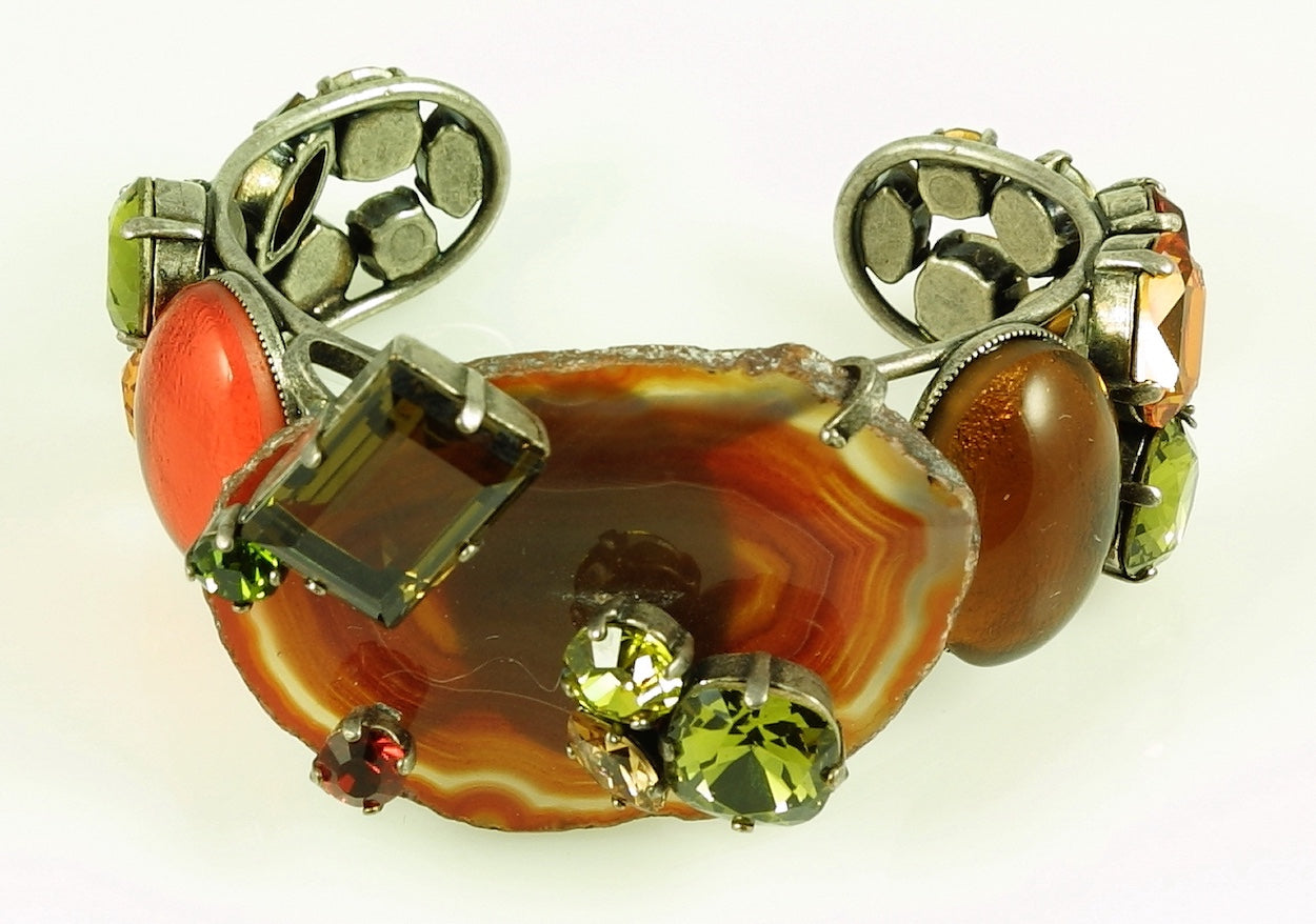 Haute Couture French Designer Philippe Ferrandis Has been designing high fashion jewellery since 1986. This bold statement cuff features genuine Swarovski Crystals, glass cabochons, and a gorgeous slice of agate.