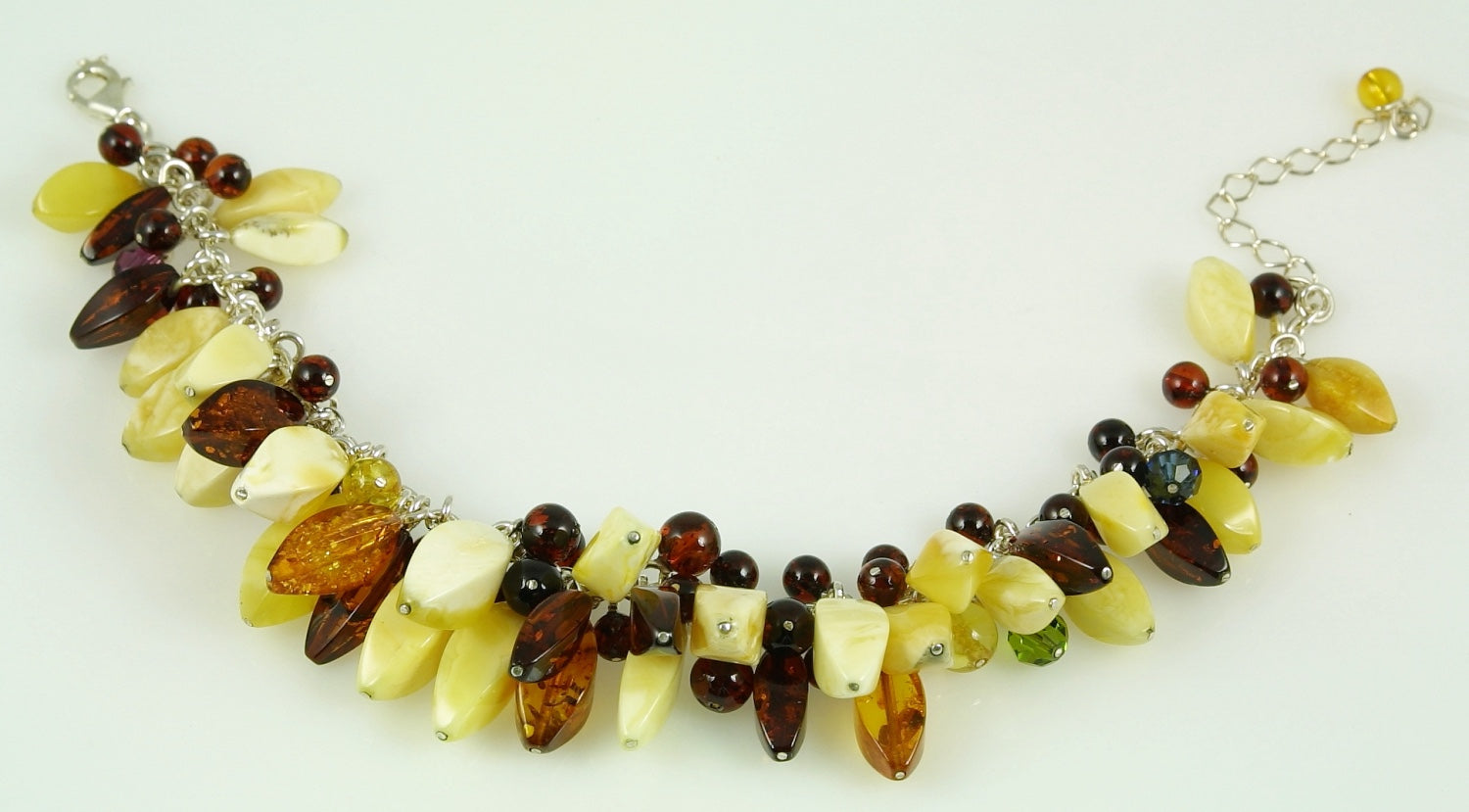 This beautiful designer bracelet features genuine Baltic amber in colours ranging from buterscotch to deepest cognac. It is teamed up with Swarovski Crystals in a range of colours including fuchsia, blue and green.