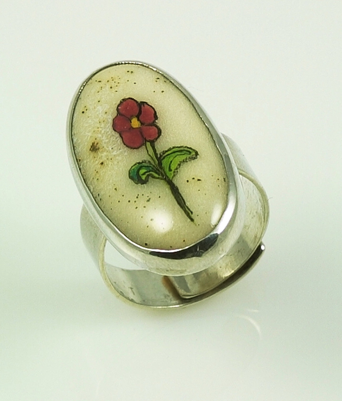 This lovely ring features a handpainted porcelian floral design set in sterling silver. Made in Poland, this is the work of a skilled silversmith and ceramic artist.