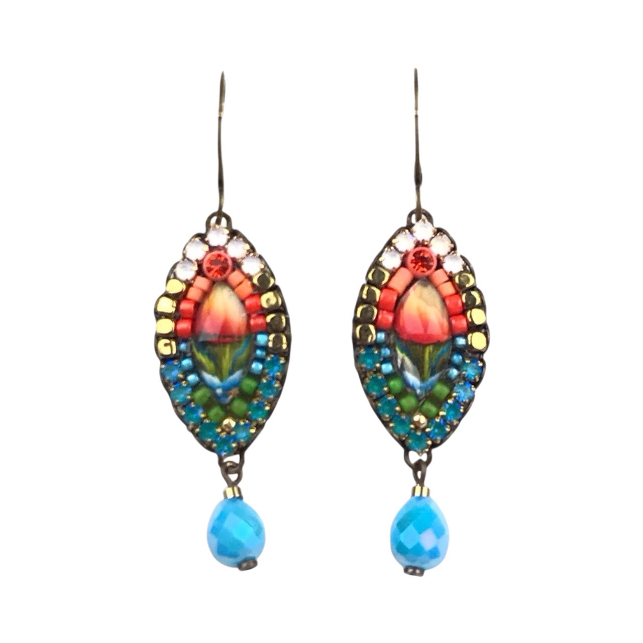 Handmade earrings with vivid colored crystals, medium size. Suitable for pierced ears, with hook closure. Antique bronze-colored brass base. Cabochons and glass beads.